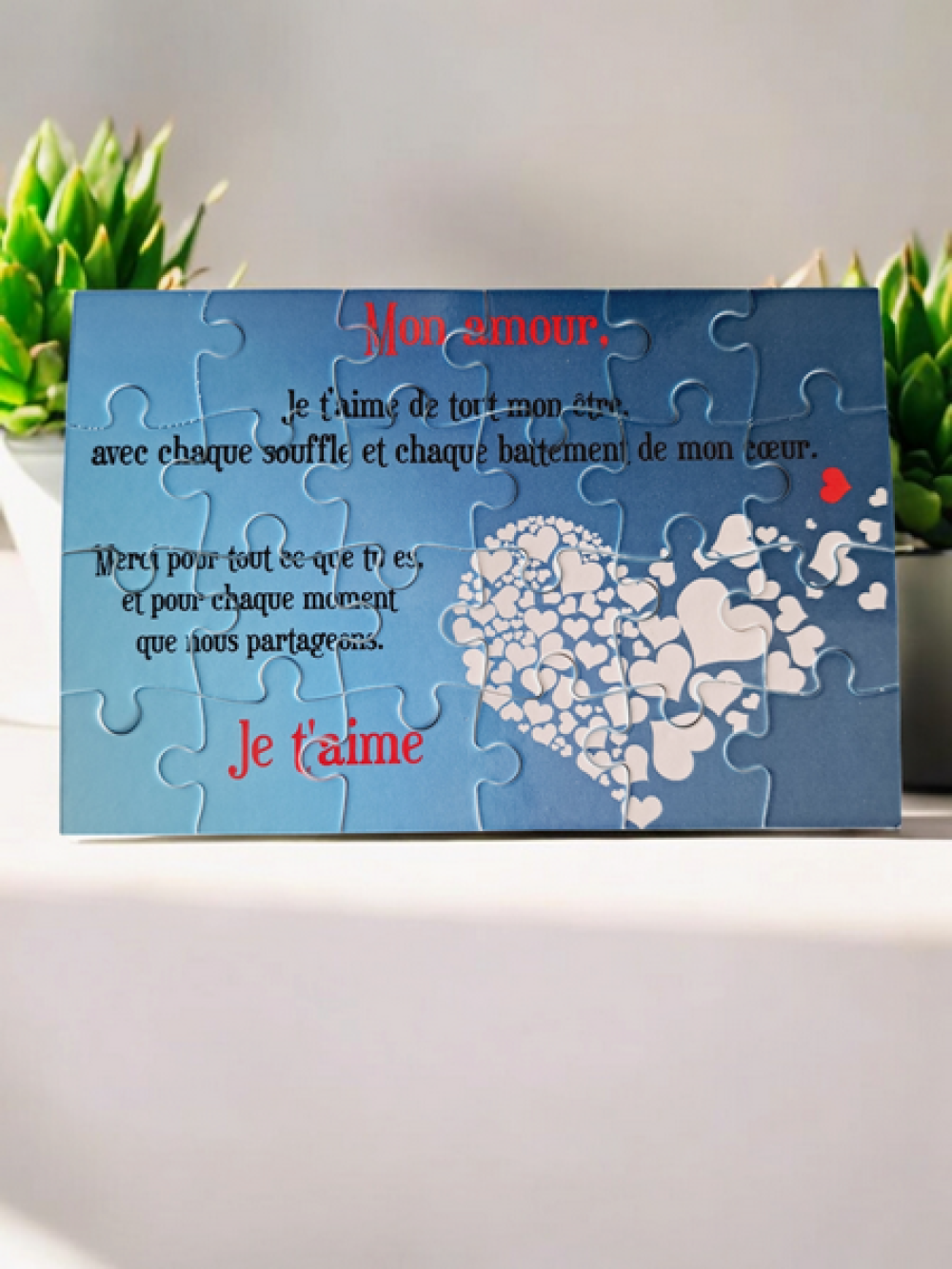 Exprimez vos sentiments avec un puzzle personnalisé unique pour l'être aimé ! Ce puzzle de 16,5 cm x 11 cm, composé de 24 pièces, cache un message d'amour à découvrir pièce par pièce. Livré dans un élégant pochon, il est prêt à être offert pour un moment de tendresse inoubliable. Une attention délicate et originale qui fait battre le cœur."