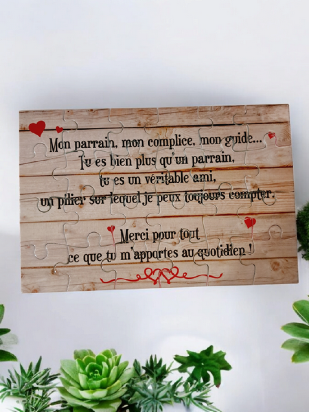 À la recherche d’un cadeau unique pour un parrain exceptionnel ? Ce puzzle de 24 pièces (16,5 cm x 11 cm), avec un joli texte, est l’attention idéale pour rappeler à un parrain toute l’importance de son rôle. Une touche personnalisée qui fera fondre son cœur et rendra hommage à son soutien et à sa présence précieuse. Un cadeau qui fera de beaux souvenirs à partager ensemble !