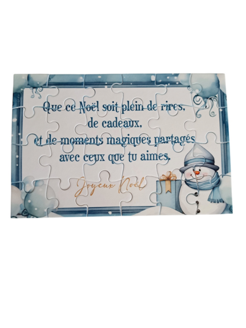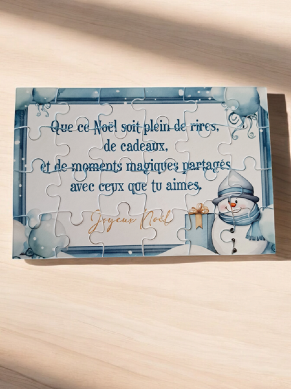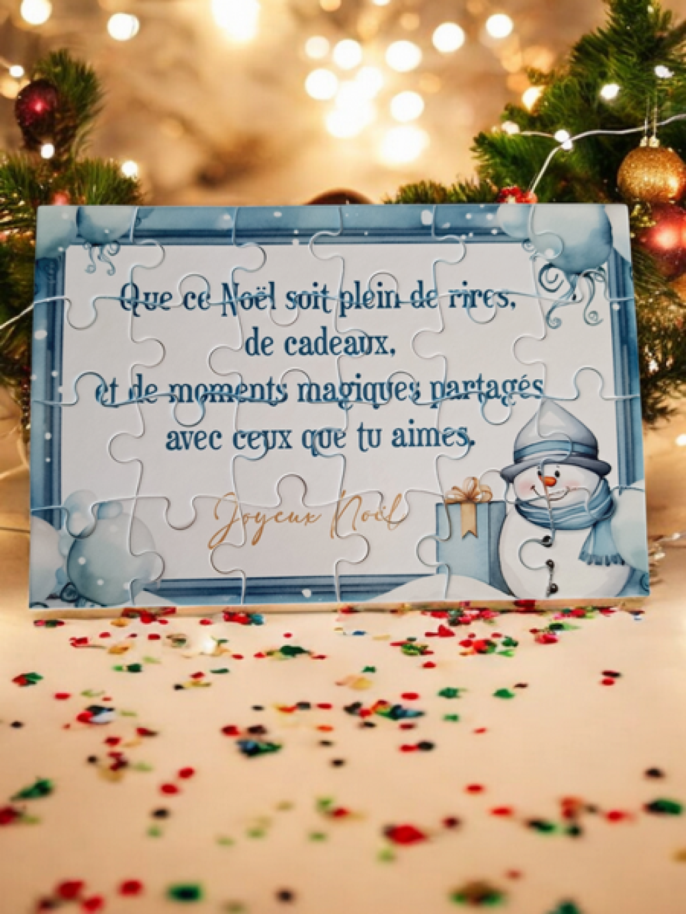 Offrez un moment de magie avec notre puzzle de Noël ! Ce puzzle de 24 pièces (16,5 cm x 11 cm), orné d’un joli texte, est parfait pour célébrer l’esprit de Noël. À partager en famille ou entre amis, ce cadeau personnalisé rappellera les moments chaleureux de la saison des fêtes. Un présent original, idéal pour glisser un message festif et créer de beaux souvenirs !