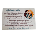 Un cadeau unique pour un(e) ami(e) précieux(se) ! Ce puzzle de 24 pièces (16,5 cm x 11 cm), personnalisé avec un joli texte, est l’attention parfaite pour exprimer votre affection. Un cadeau original et plein de sens, idéal pour partager de beaux souvenirs et renforcer ce lien spécial qui vous unit. Offrez un moment de complicité et de tendresse avec ce puzzle unique, créé spécialement pour votre ami(e)