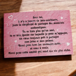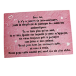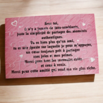 Un cadeau unique pour un(e) ami(e) précieux(se) ! Ce puzzle de 24 pièces (16,5 cm x 11 cm), personnalisé avec un joli texte, est l’attention parfaite pour exprimer votre affection. Un cadeau original et plein de sens, idéal pour partager de beaux souvenirs et renforcer ce lien spécial qui vous unit. Offrez un moment de complicité et de tendresse avec ce puzzle unique, créé spécialement pour votre ami(e)