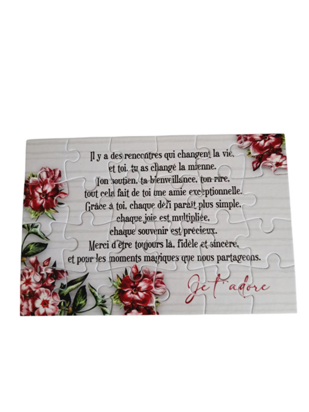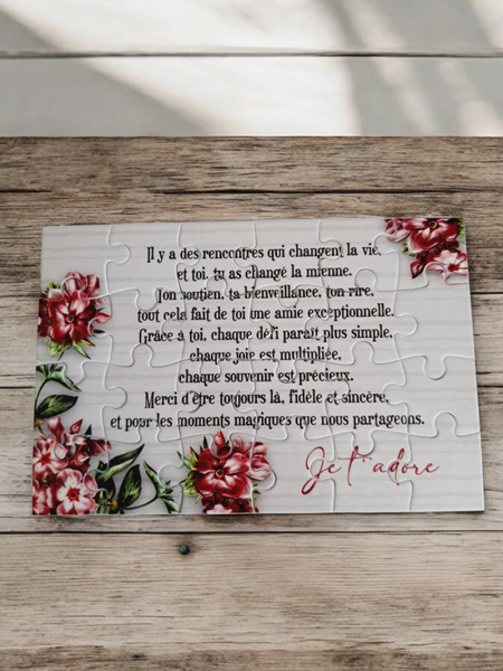 Un cadeau unique pour un(e) ami(e) précieux(se) ! Ce puzzle de 24 pièces (16,5 cm x 11 cm), personnalisé avec un joli texte, est l’attention parfaite pour exprimer votre affection. Un cadeau original et plein de sens, idéal pour partager de beaux souvenirs et renforcer ce lien spécial qui vous unit. Offrez un moment de complicité et de tendresse avec ce puzzle unique, créé spécialement pour votre ami(e)