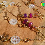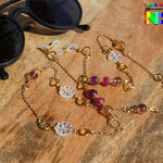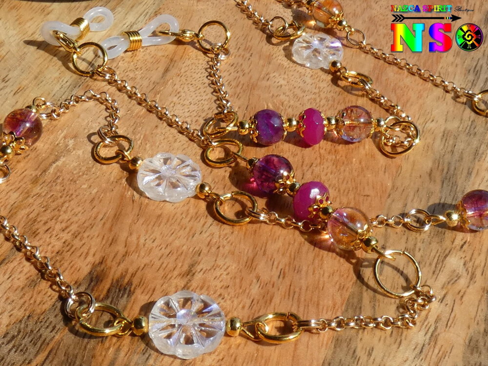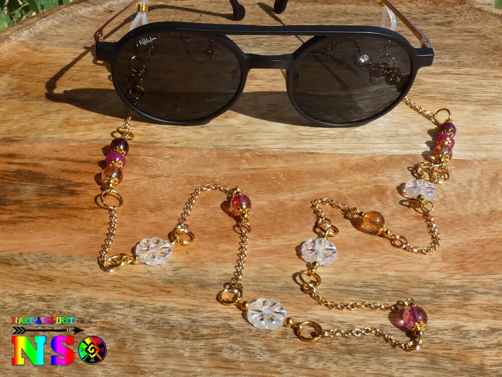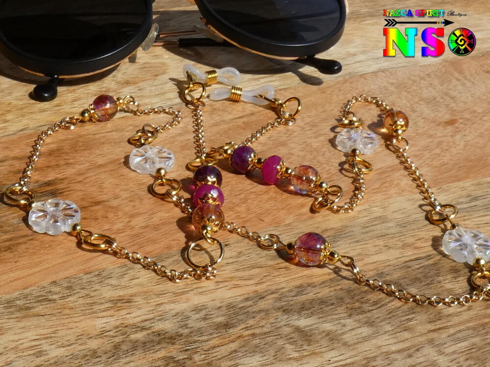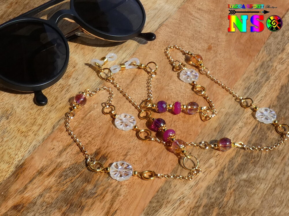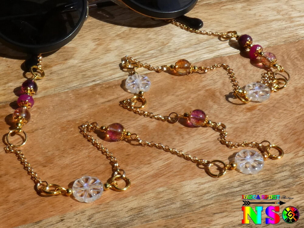 Je vous propose, ici, une de mes créations entièrement réalisée à la main par l'Atelier Nazca Spirit. une superbe chaîne de lunettes aux tons de coucher de soleil.
