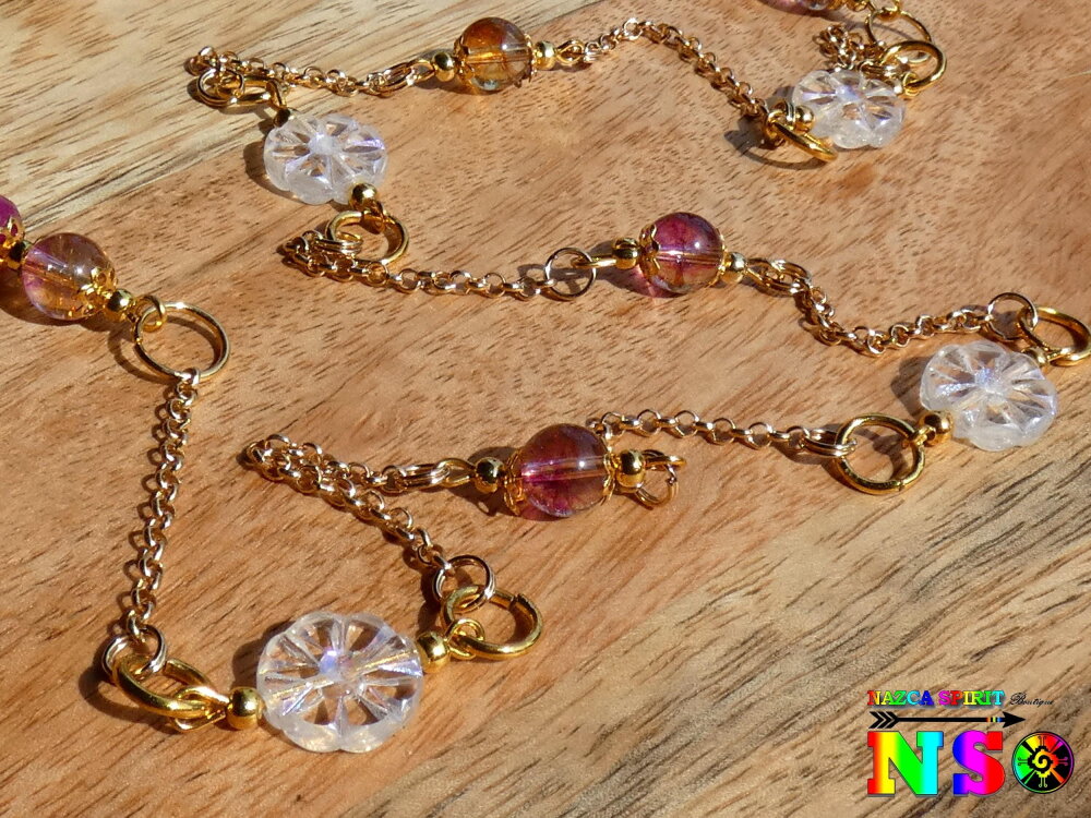 Chaîne de Lunettes, Collier sautoir bracelet, Laiton or, Perles Facettées Soleils Cristal Bohème Aurore Boréale, bijou Original bi fonction