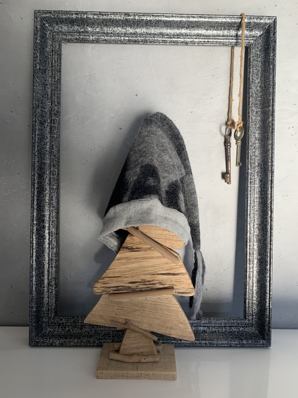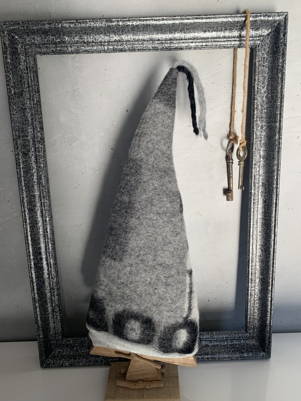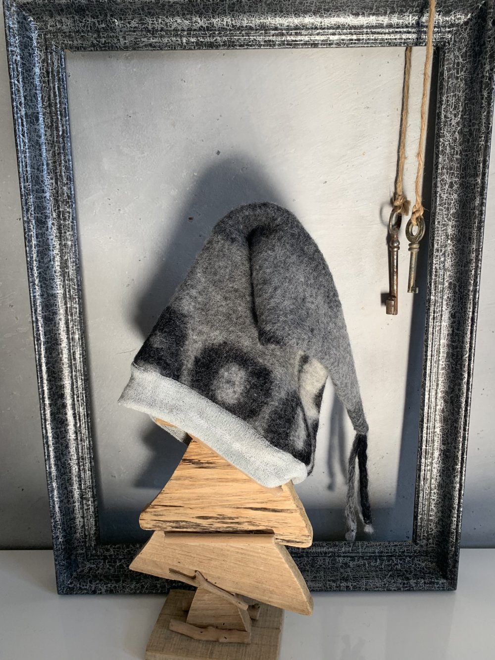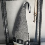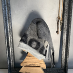 Bonnet de lutin fantaisie de 1 à 3 ans réalisé dans deux matières: - une maille bouclette grise toute douce pour le tour de tête. - une laine bouillie imprimée bien chaude