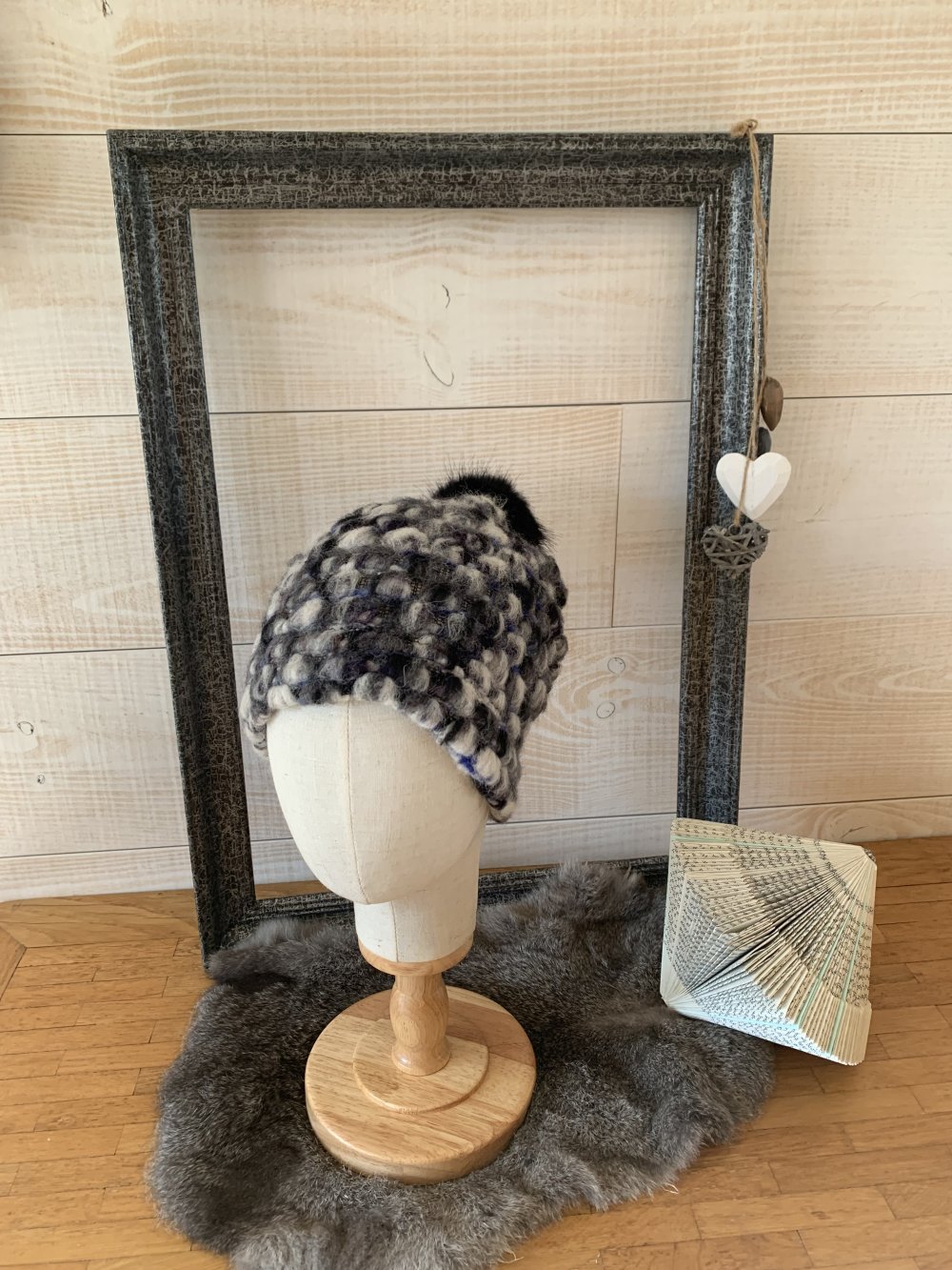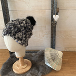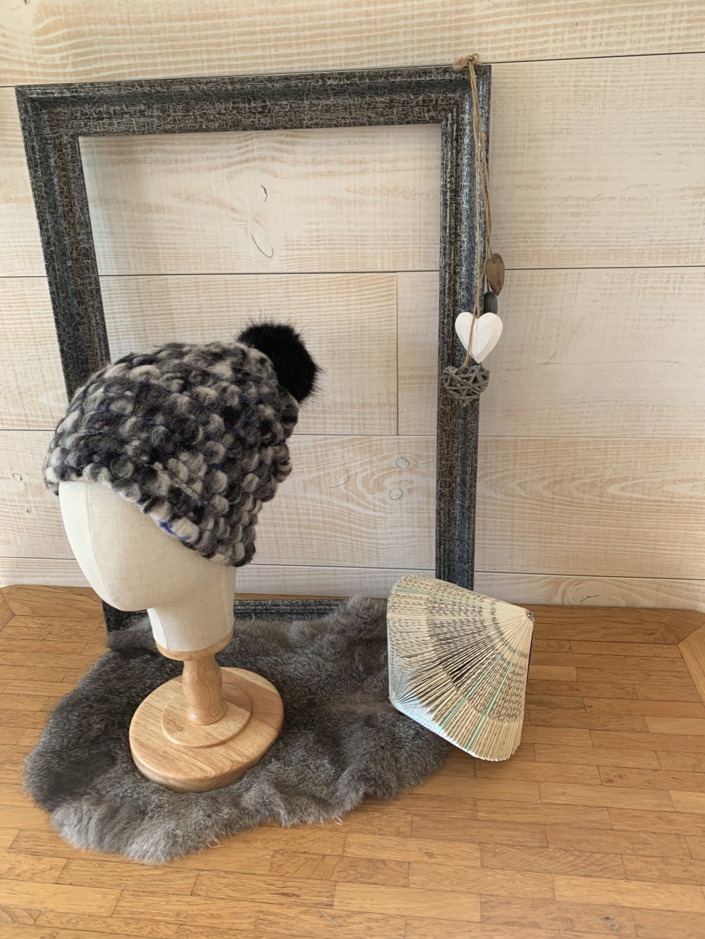 Bonnet à pompon réalisé dans une maille aérée ''bosselée'' légère, moelleuse mais également bien chaude.