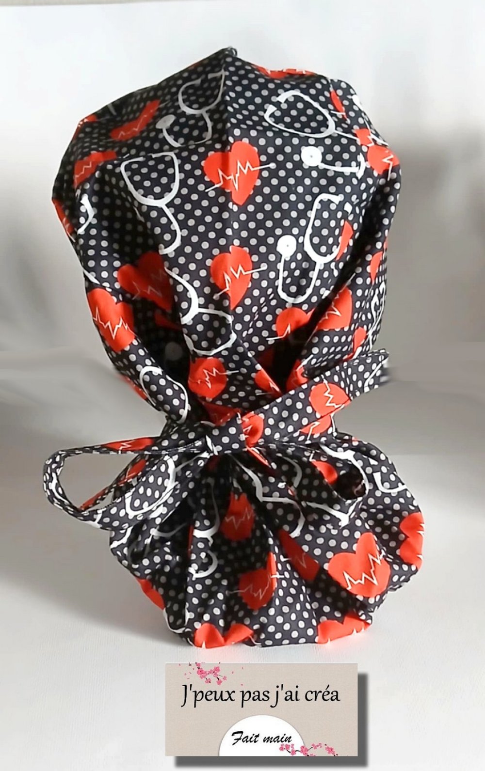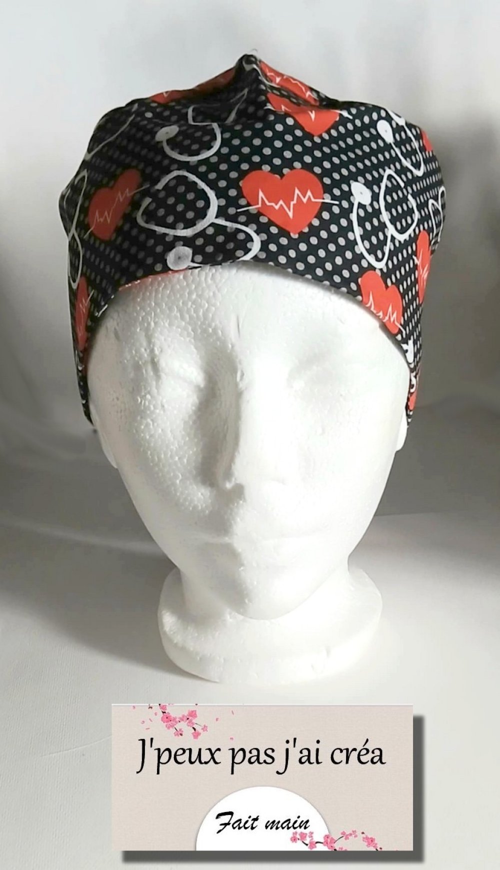 Calot de bloc pour cheveux long/ Pour tous professionnels / bloc opératoire /Chirurgien /Anesthésiste/ Infirmière / Aide soignant(e) / dentiste / vétérinaire / Pâtissier / Boulanger / Traiteur/ motif cœur,stéthoscope