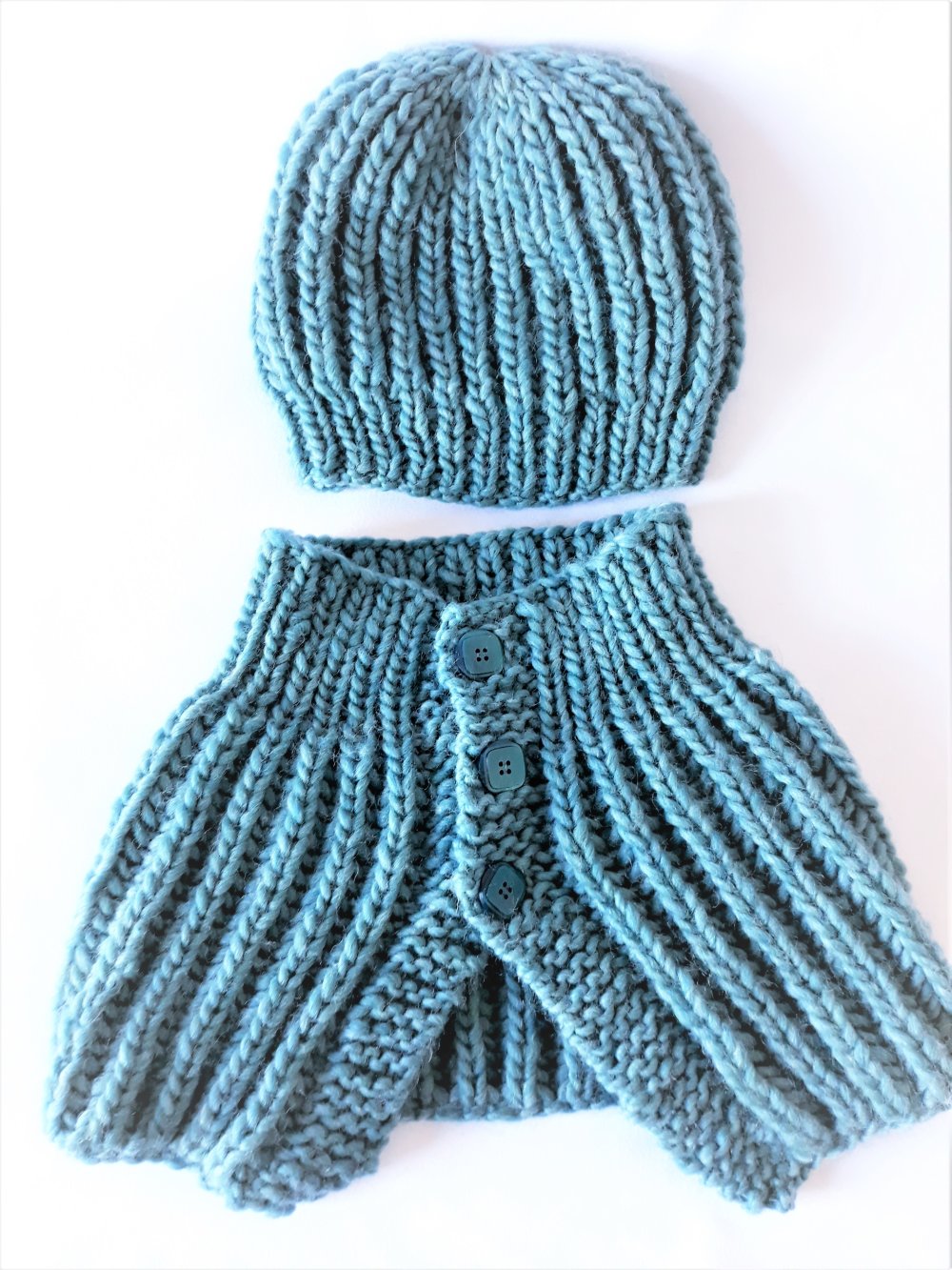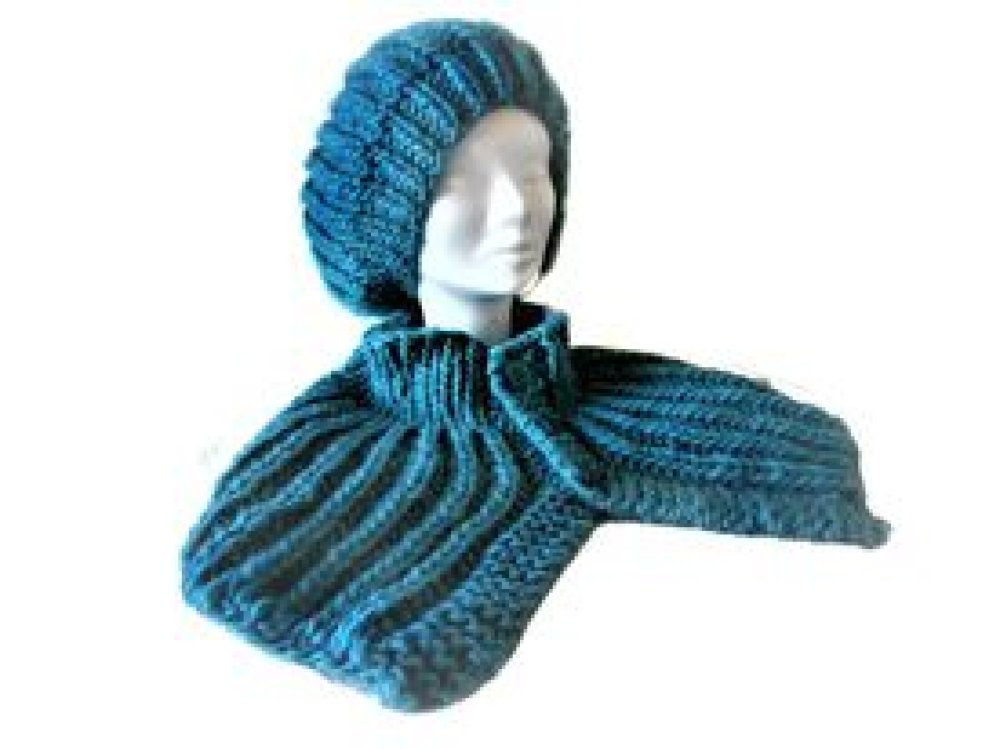 Bonnet + tour de cou pure laine vierge, bleu/vert océan