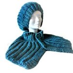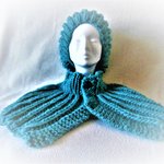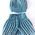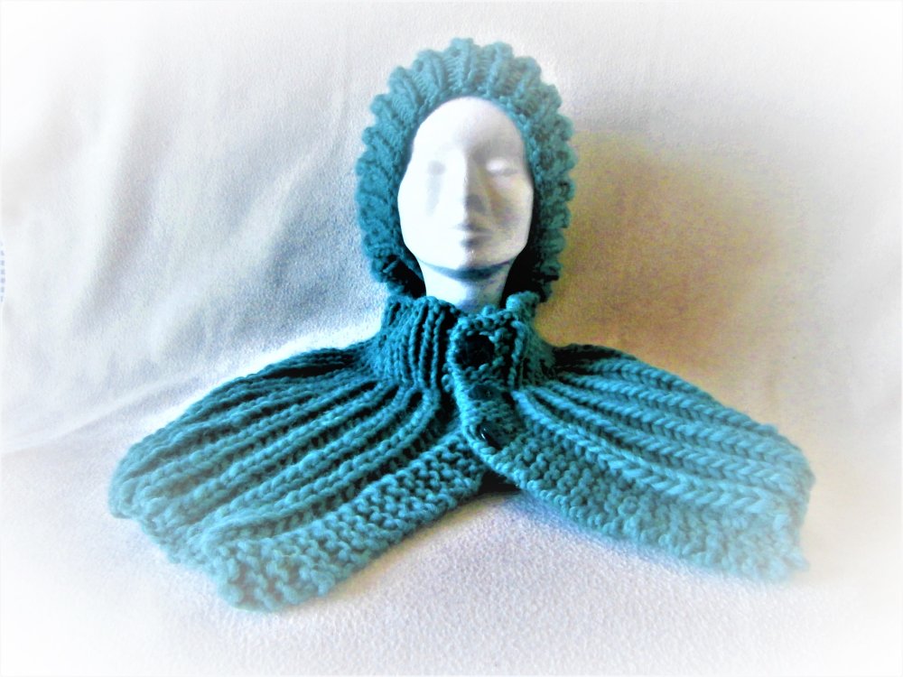 Pour affronter le froid de l'hiver voici un ensemble composé d'un bonnet et d'un tour de cou (snood) tricotés à la main en maille anglaise et aux aiguilles. Le fil à tricoter Drops est en pure laine vierge de couleur bleu/vert océan. Le tour de cou est fermé par 3 boutons assortis.