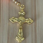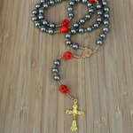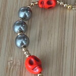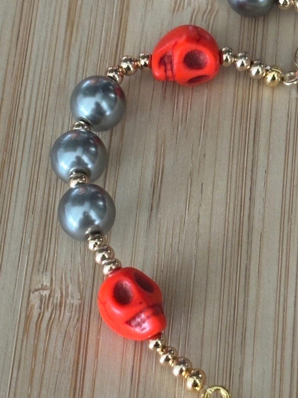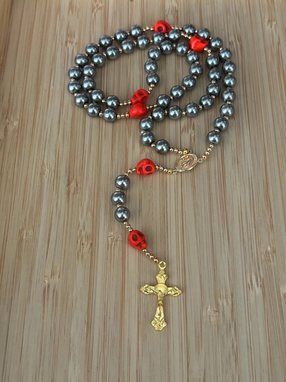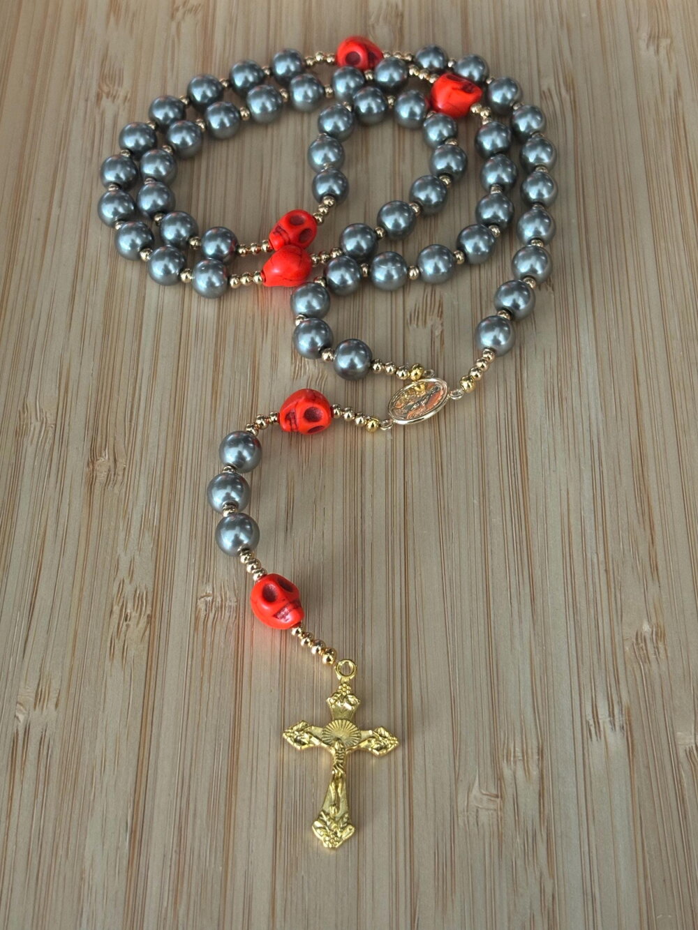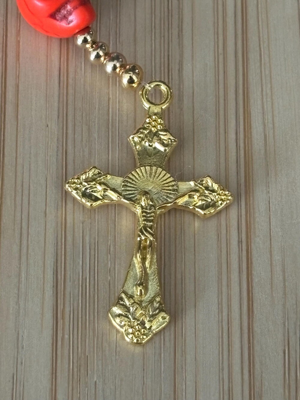 Chapelet Chrétien, rosaire Chrétien composé de perles 8 mm our nacré en verre , de crâne en pierre naturelle couleur orange.