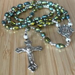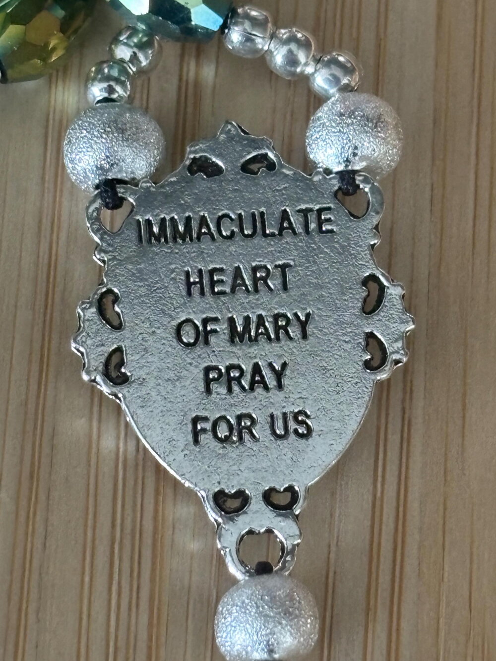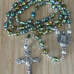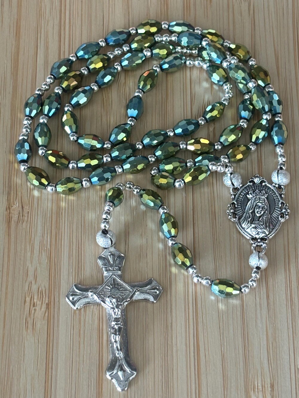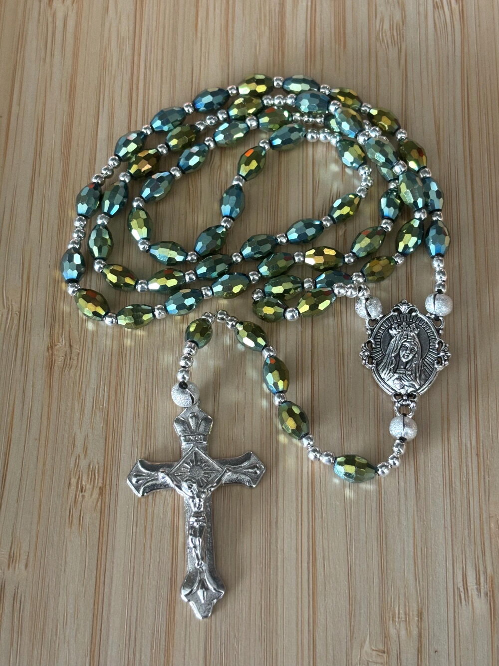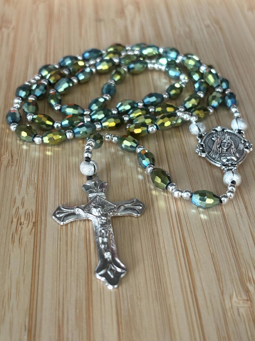 Chapelet Chrétien fait main et unique, avec des perles en cristal de bohème, couleur vert métallisé.