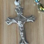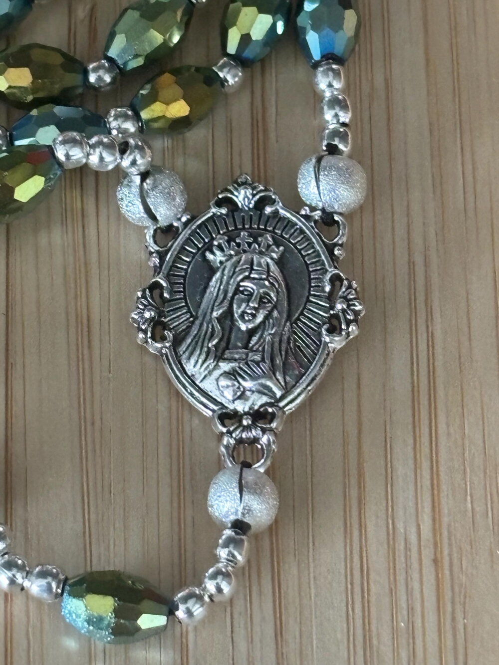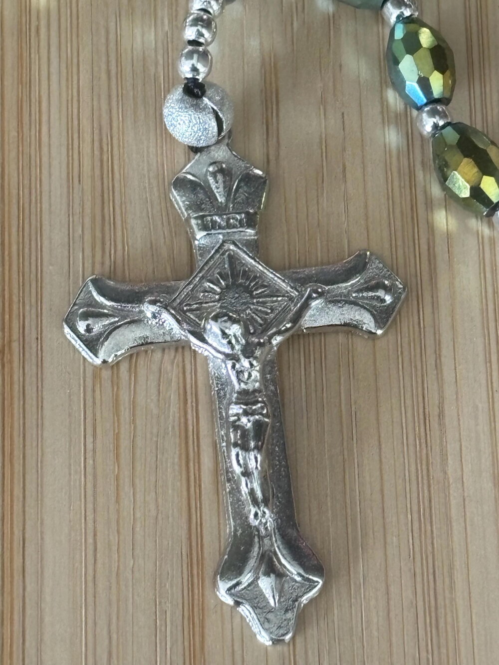 Chapelet chrétien cristal de bohème, vert métallique, réalisé à la main , fermoir de côté, croix argenté, fabriqué en France, modèle unique.