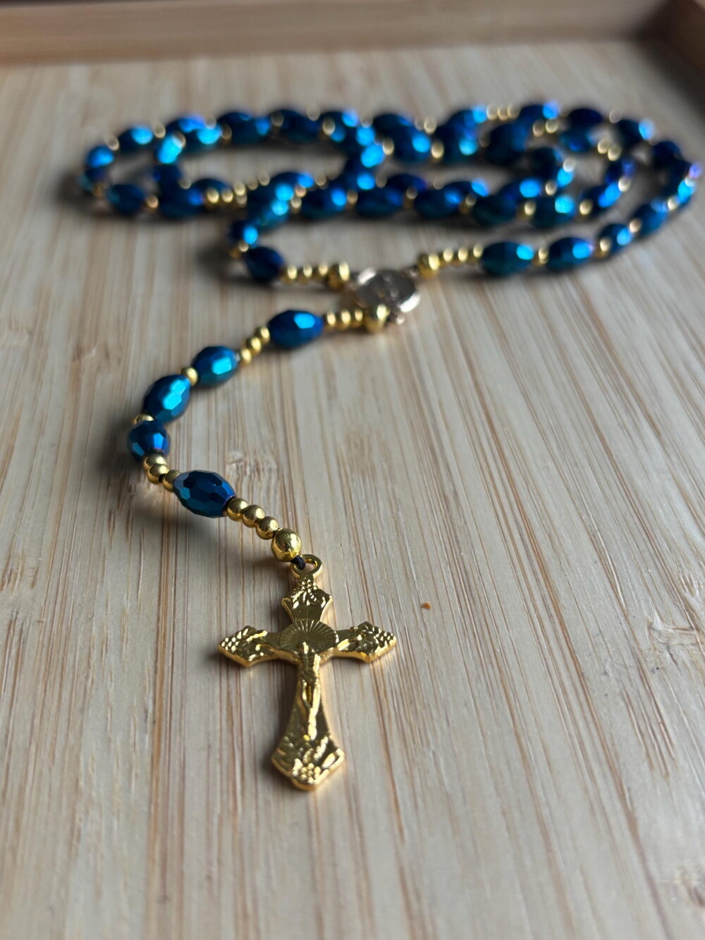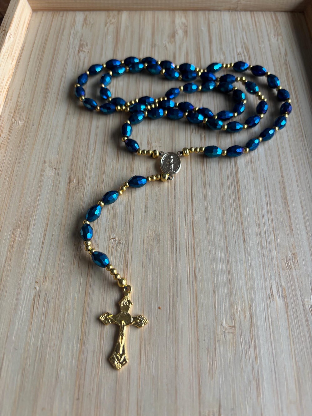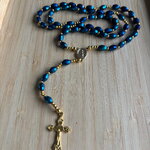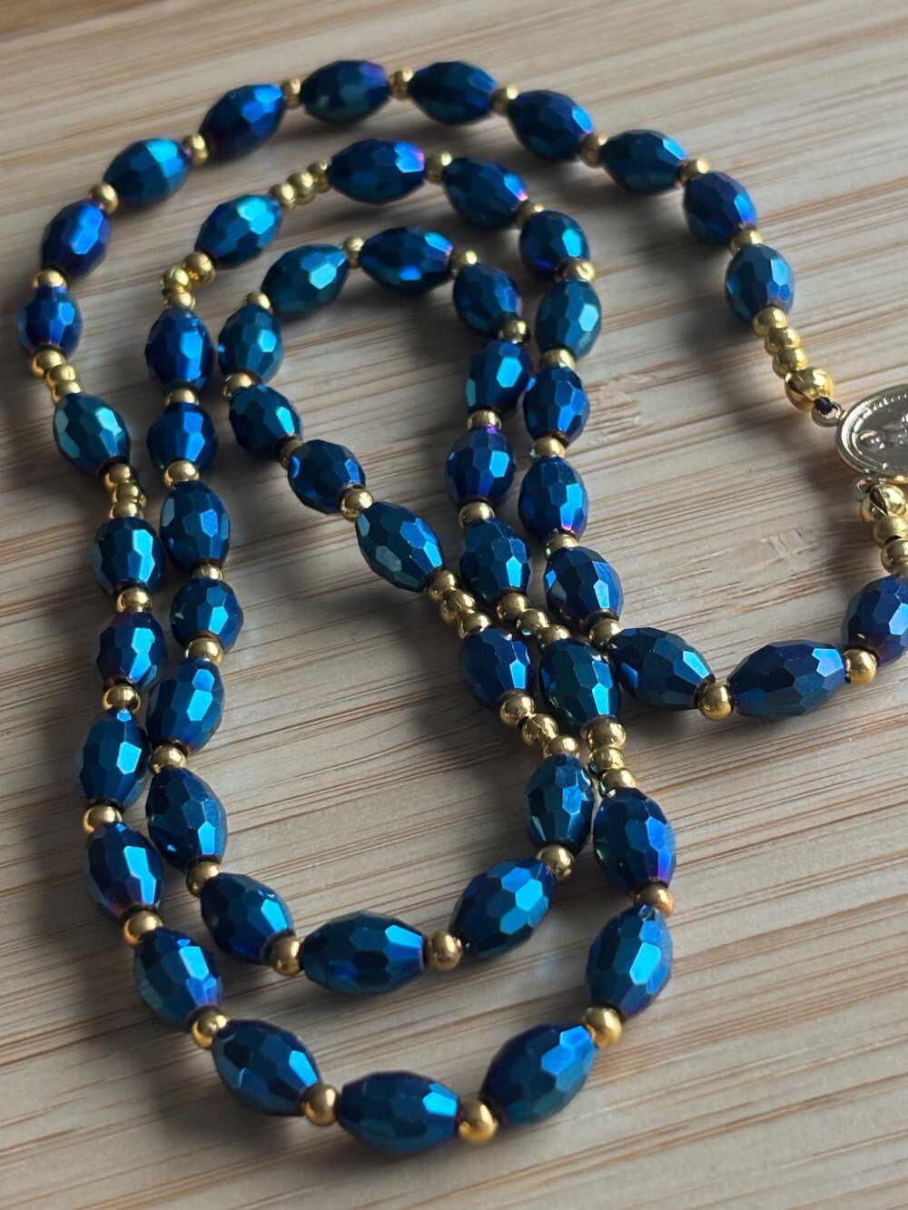 Chapelet Chrétien fait main et unique, avec des perles en cristal de bohème, couleur bleu métallisé.
