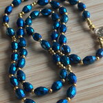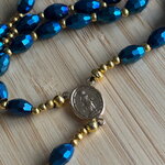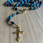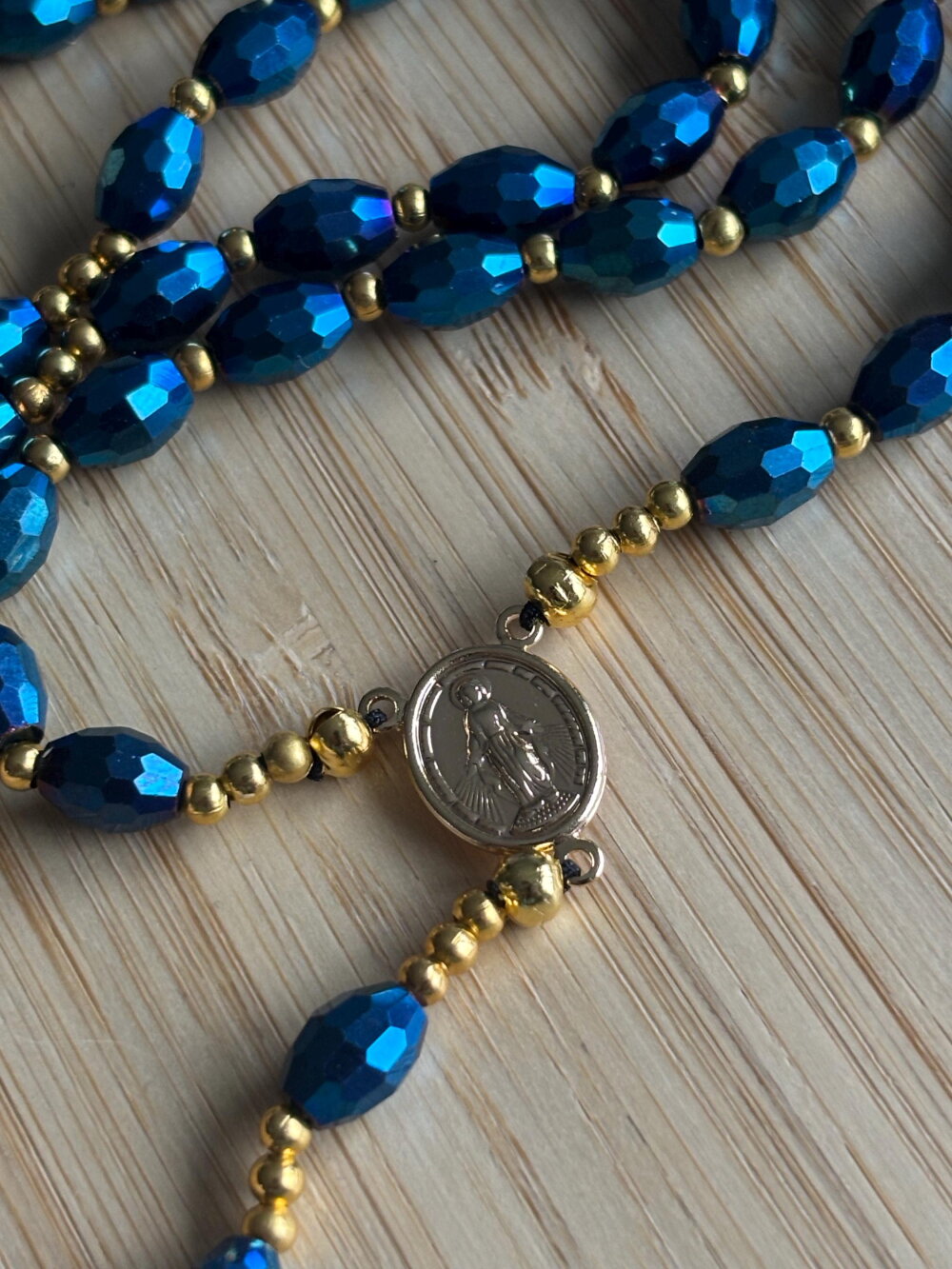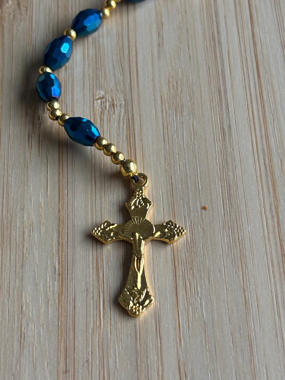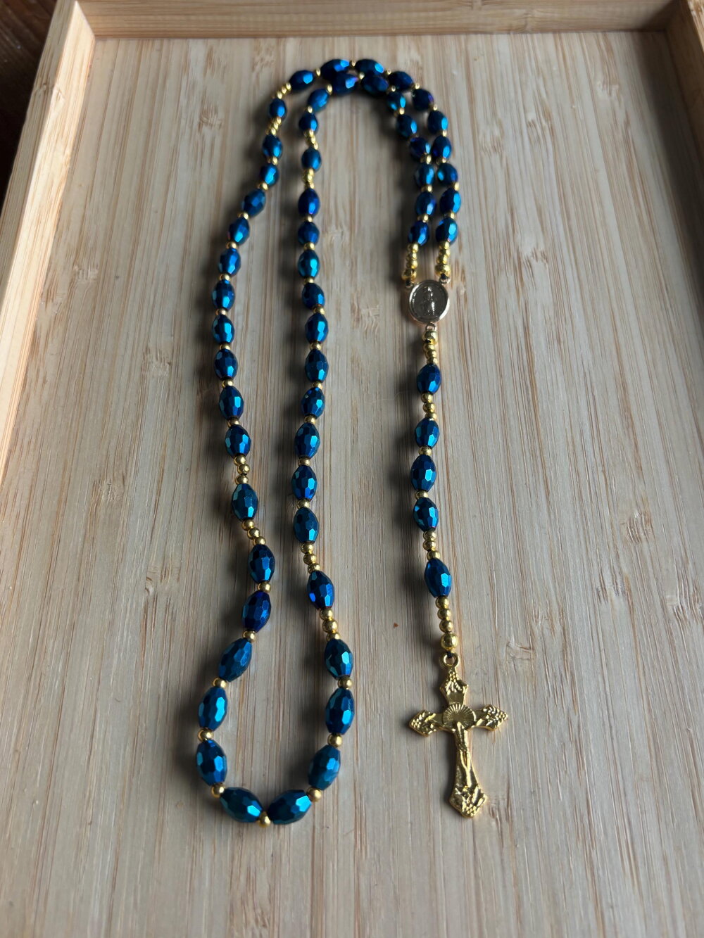 Chapelet Chrétien fait main et unique, avec des perles en cristal de bohème, couleur bleu métallisé.
