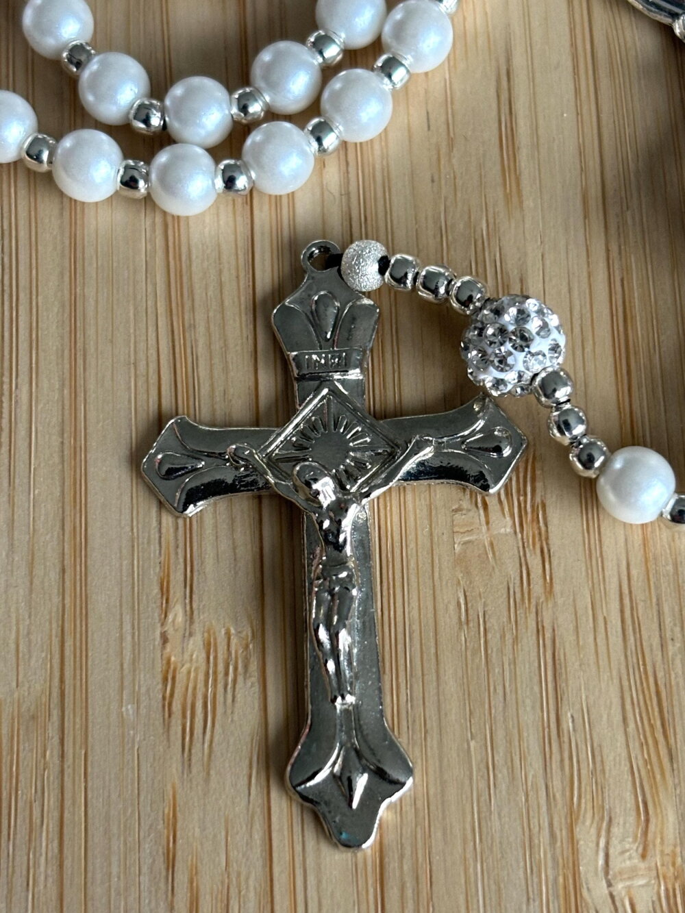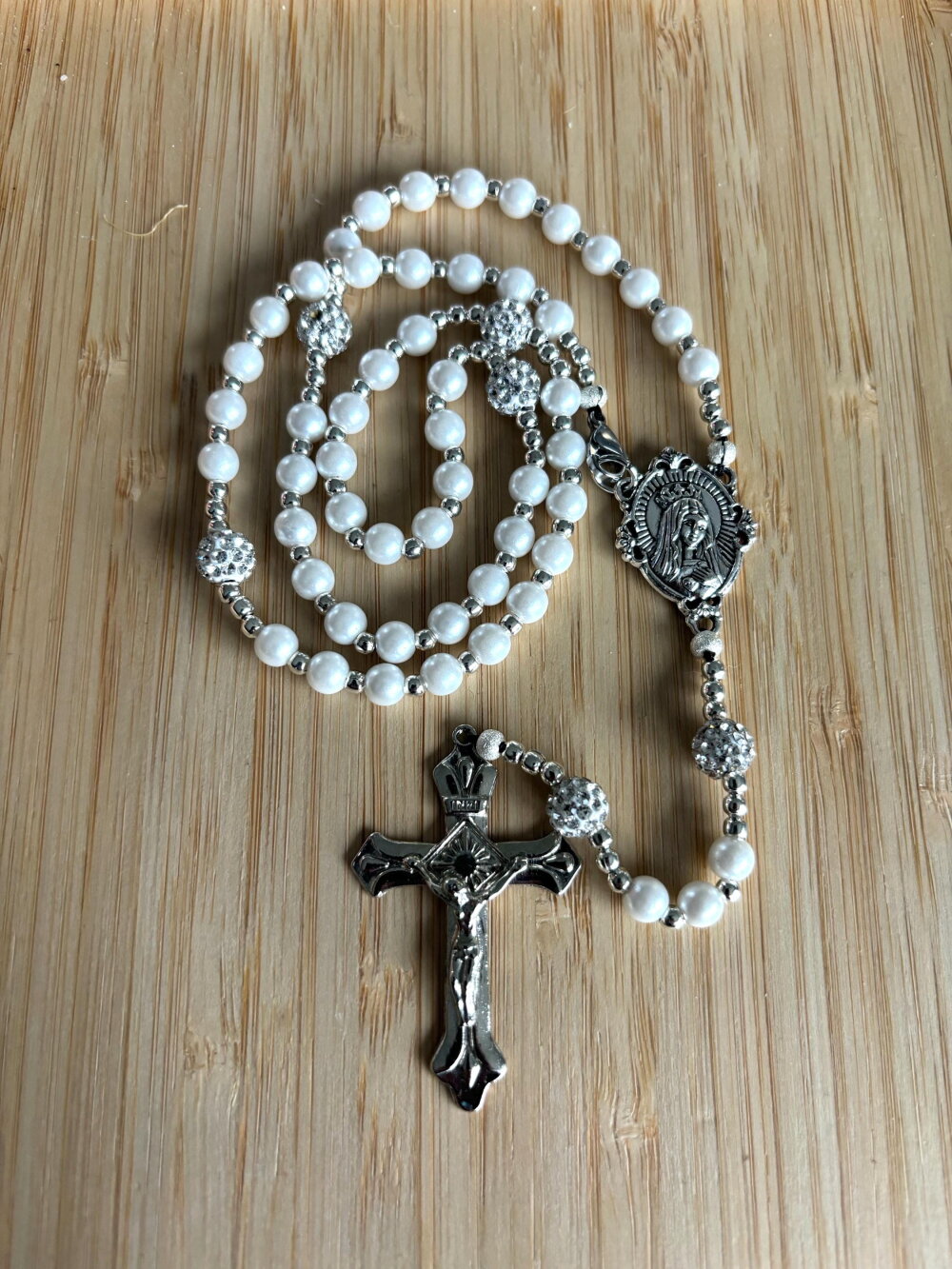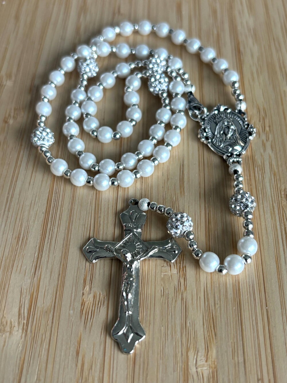 Chapelet Chrétien traditionnel composé de perles blanches satinées de 6 mm, de 8 mm strass.