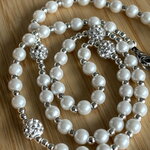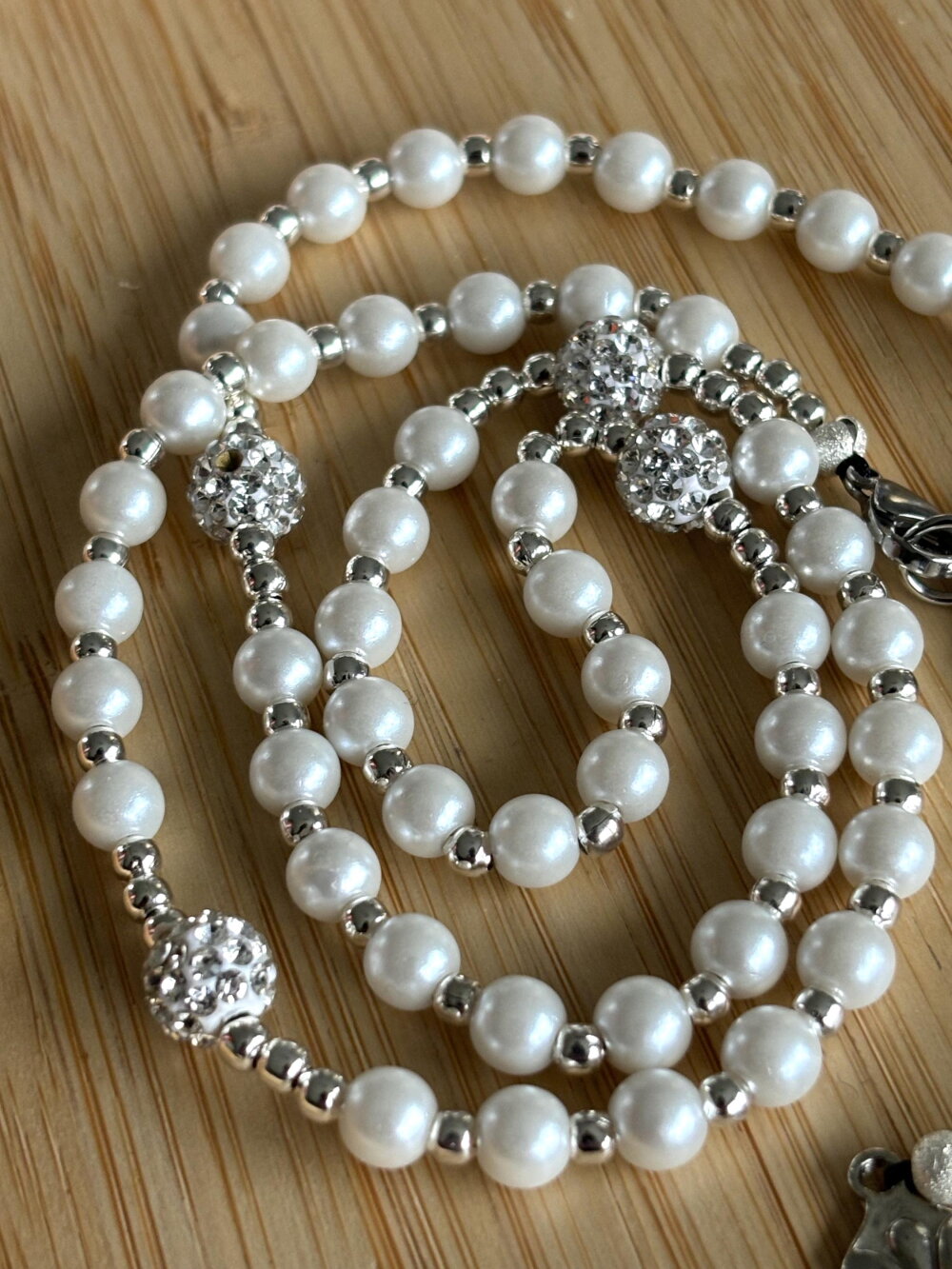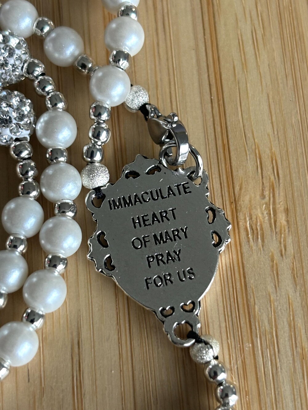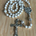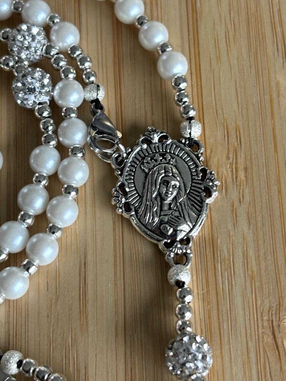 Chapelet Chrétien traditionnel composé de perles blanches satinées de 6 mm, de 8 mm strass.