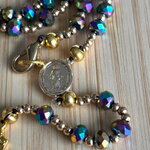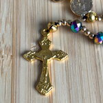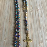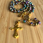 Chapelet Chrétien , rosaire Chrétien fait main, chapelet composé de perles en cristal noir avec des reflets violet irisé avec sa croix or en métal inoxydable.
