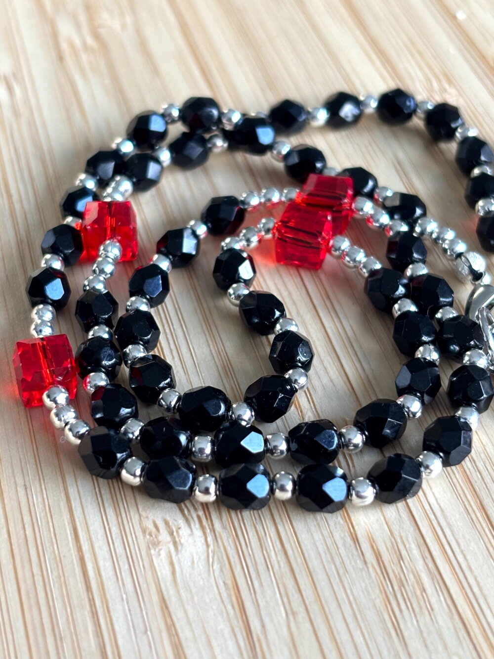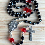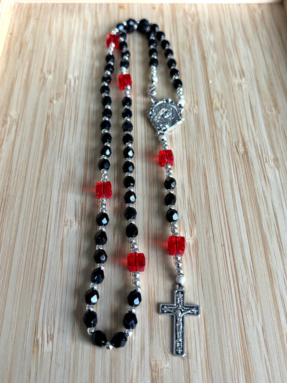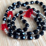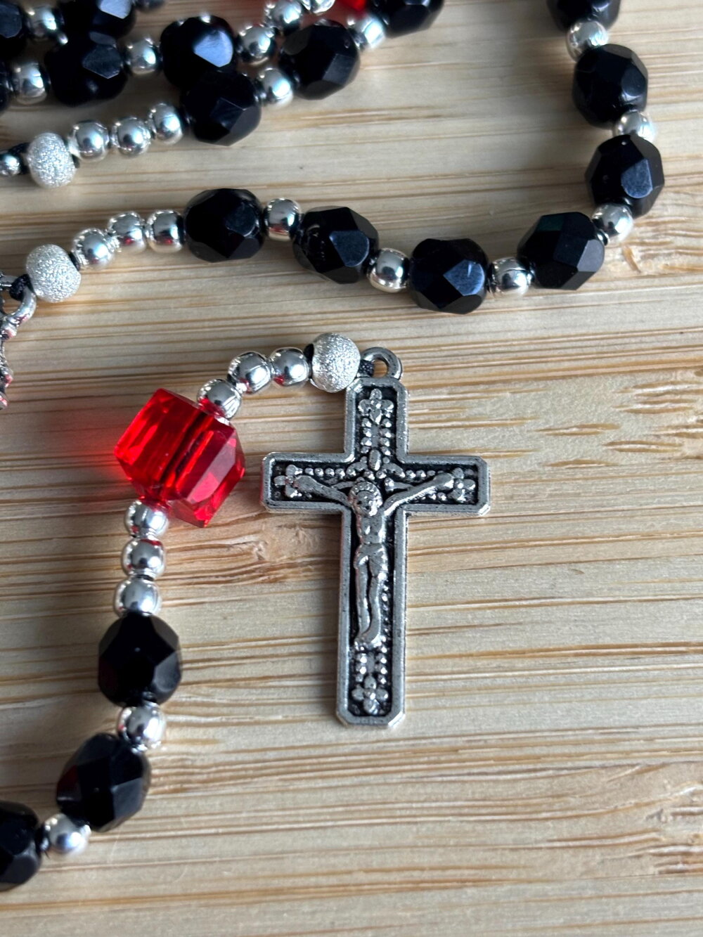 Chapelet Chrétien , rosaire Chrétien fait main, chapelet composé de perles en cristal de 7 mm noir et carré cristal rouge 8 mm, avec sa croix argent en métal inoxydable.