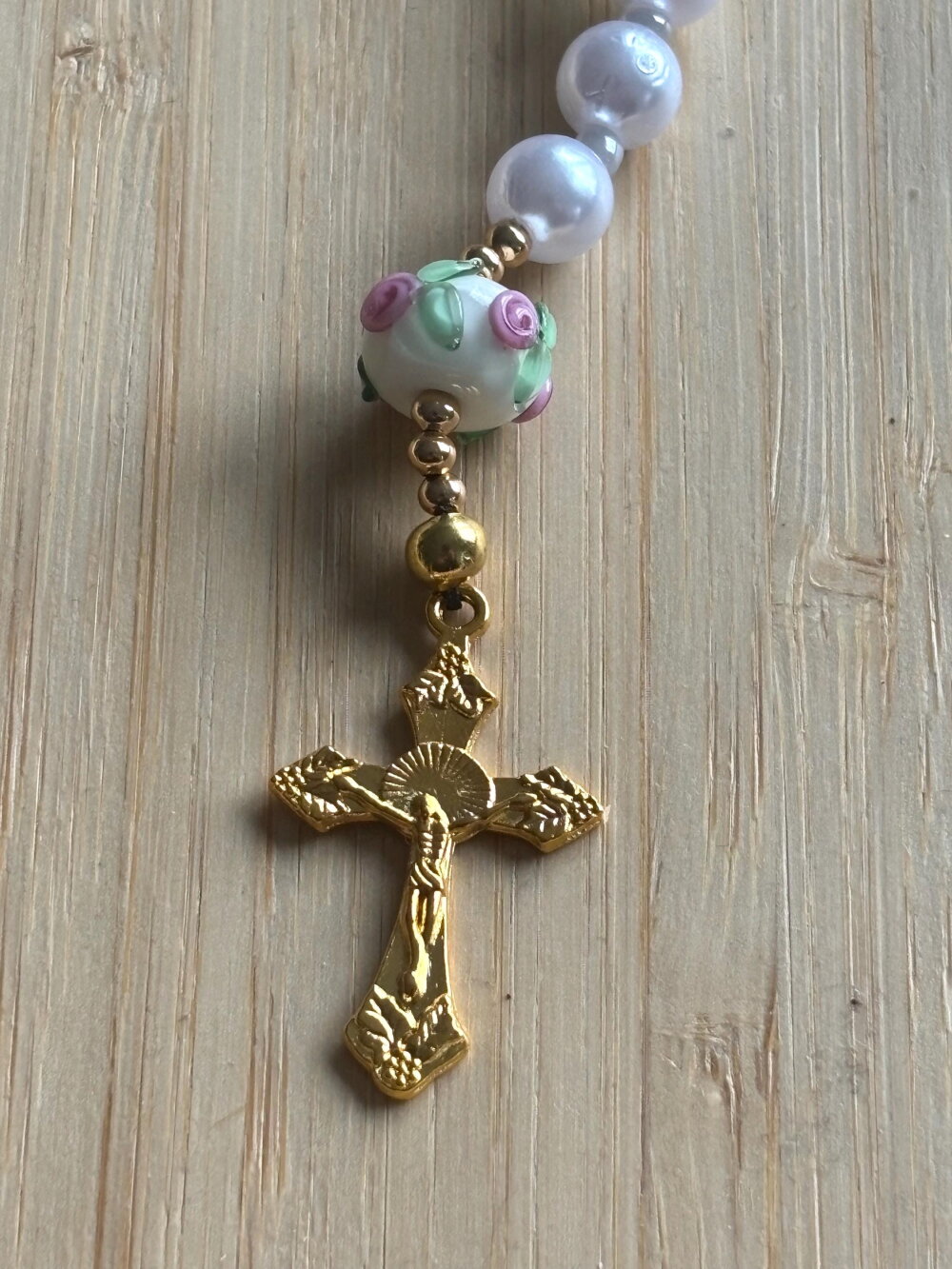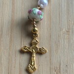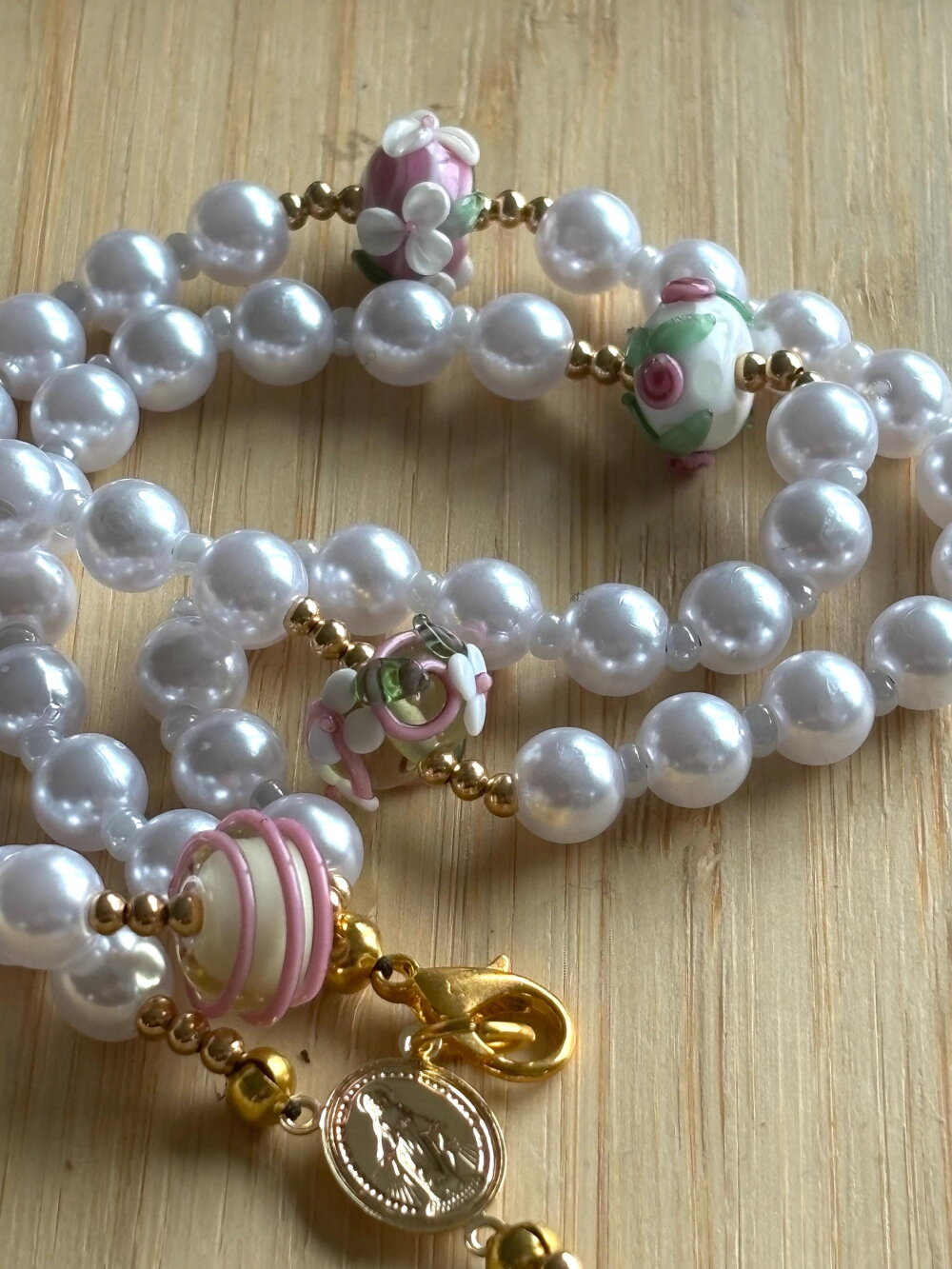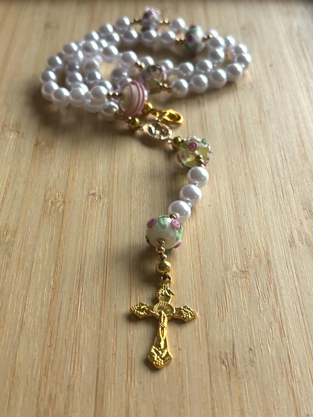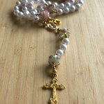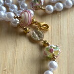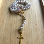 Chapelet Chrétien , chapelet Chrétien fait main, chapelet composé de perles de 8 mm nacrées blanches et des perles en en verre filé artisanalement de couleur blanc rose avec sa croix or en métal inoxydable.