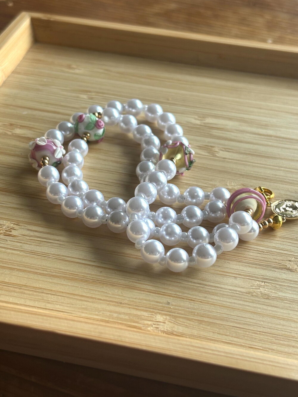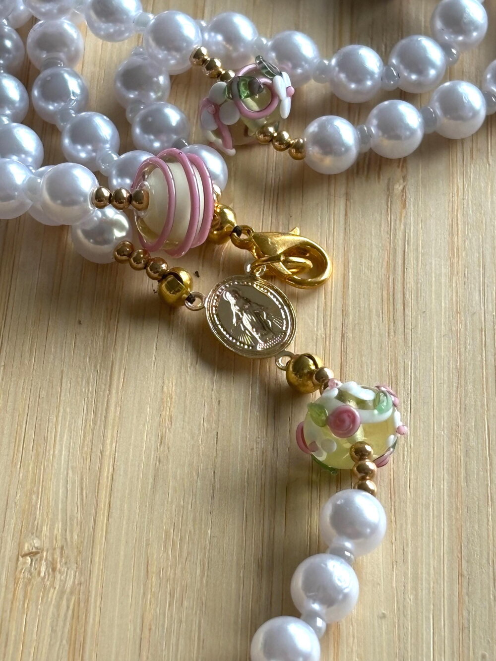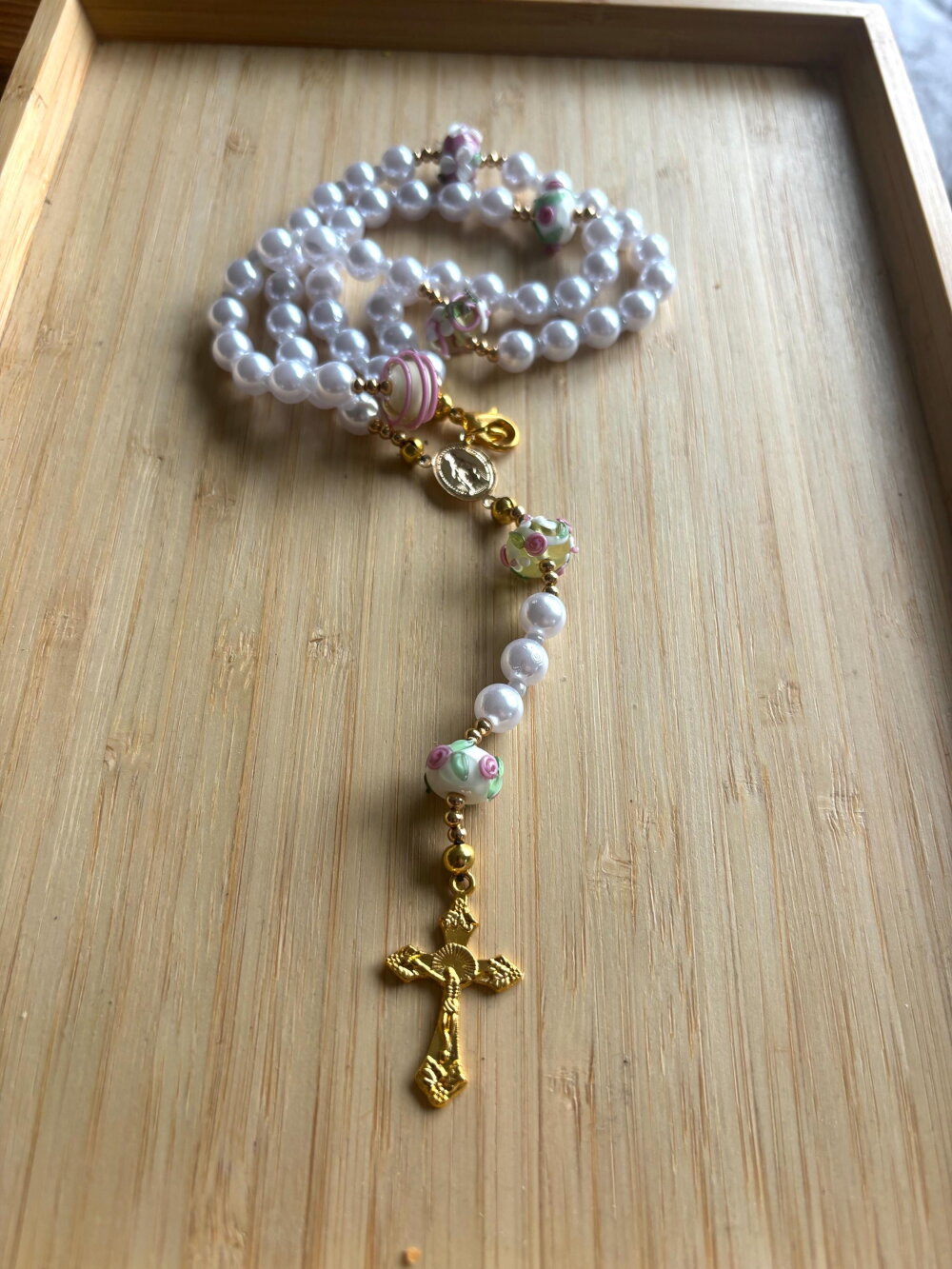 Chapelet Chrétien , chapelet Chrétien fait main, chapelet composé de perles de 8 mm nacrées blanches et des perles en en verre filé artisanalement de couleur blanc rose avec sa croix or en métal inoxydable.