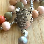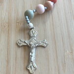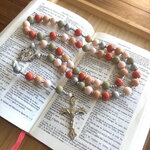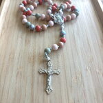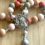 Les perles font un diamètre de 10 mm, elles s’accompagnent de perles d’espacements Myiuki de 3 mm, d’une pièce centrale représentant la vierge Marie, et d’une croix Chrétienne en métal inoxydable.