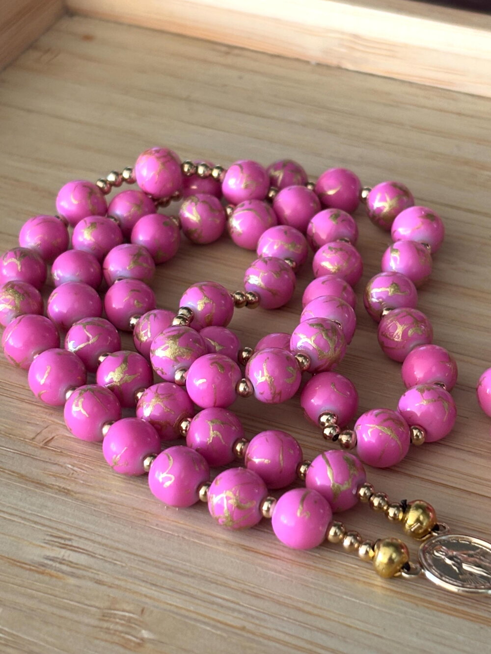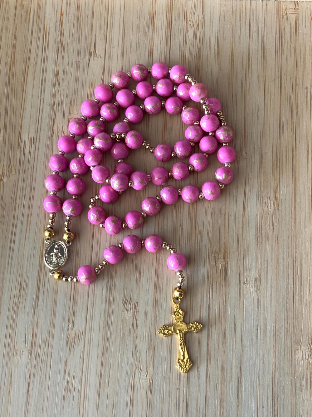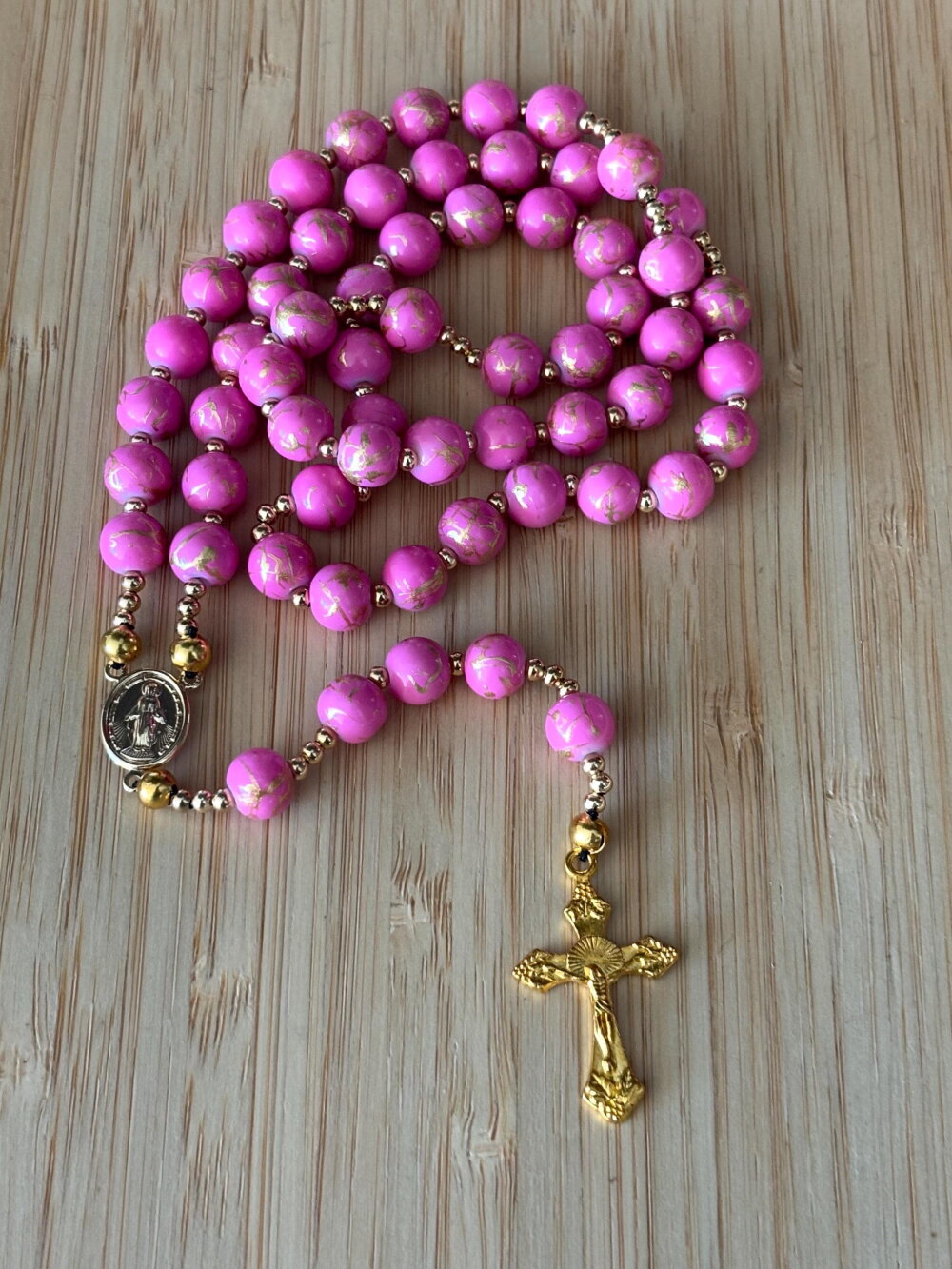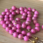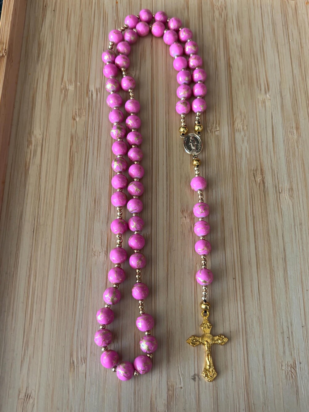 Découvrez notre chapelet artisanal en perles rose strié or , une pièce unique alliant tradition et modernité. Chaque perle de 8 mm , est soigneusement sélectionnée et assemblée à la main avec passion et savoir-faire. Pour sublimer ce chapelet, des perles d’espacement plaqué or ornent le design, apportant une touche contemporaine et raffinée.