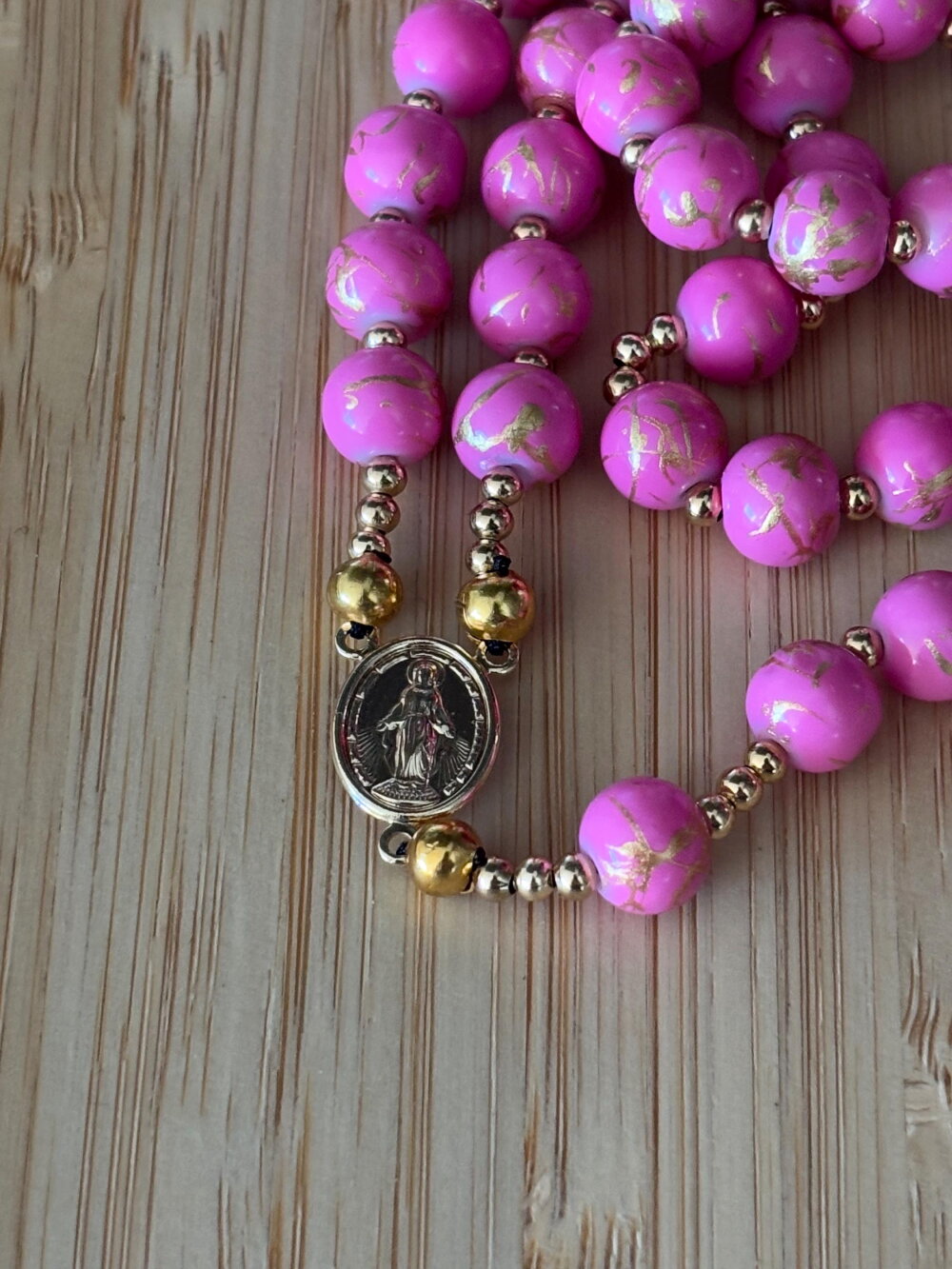 La pièce centrale plaqué or 18 k représente la Vierge Marie, symbolisant protection et grâce, et ajoute une dimension spirituelle profonde à cette création. Plus qu’un simple chapelet, il est un véritable bijou de foi, à porter ou à offrir, incarnant à la fois la beauté du savoir-faire artisanal et la modernité du design.