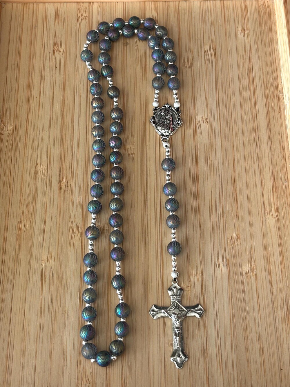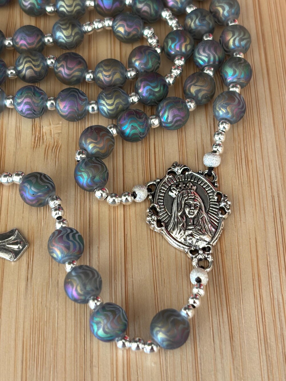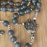 La pièce centrale représente la Vierge Marie, symbolisant protection et grâce, et ajoute une dimension spirituelle profonde à cette création. Plus qu’un simple chapelet, il est un véritable bijou de foi, à porter ou à offrir, incarnant à la fois la beauté du savoir-faire artisanal et la modernité du design.