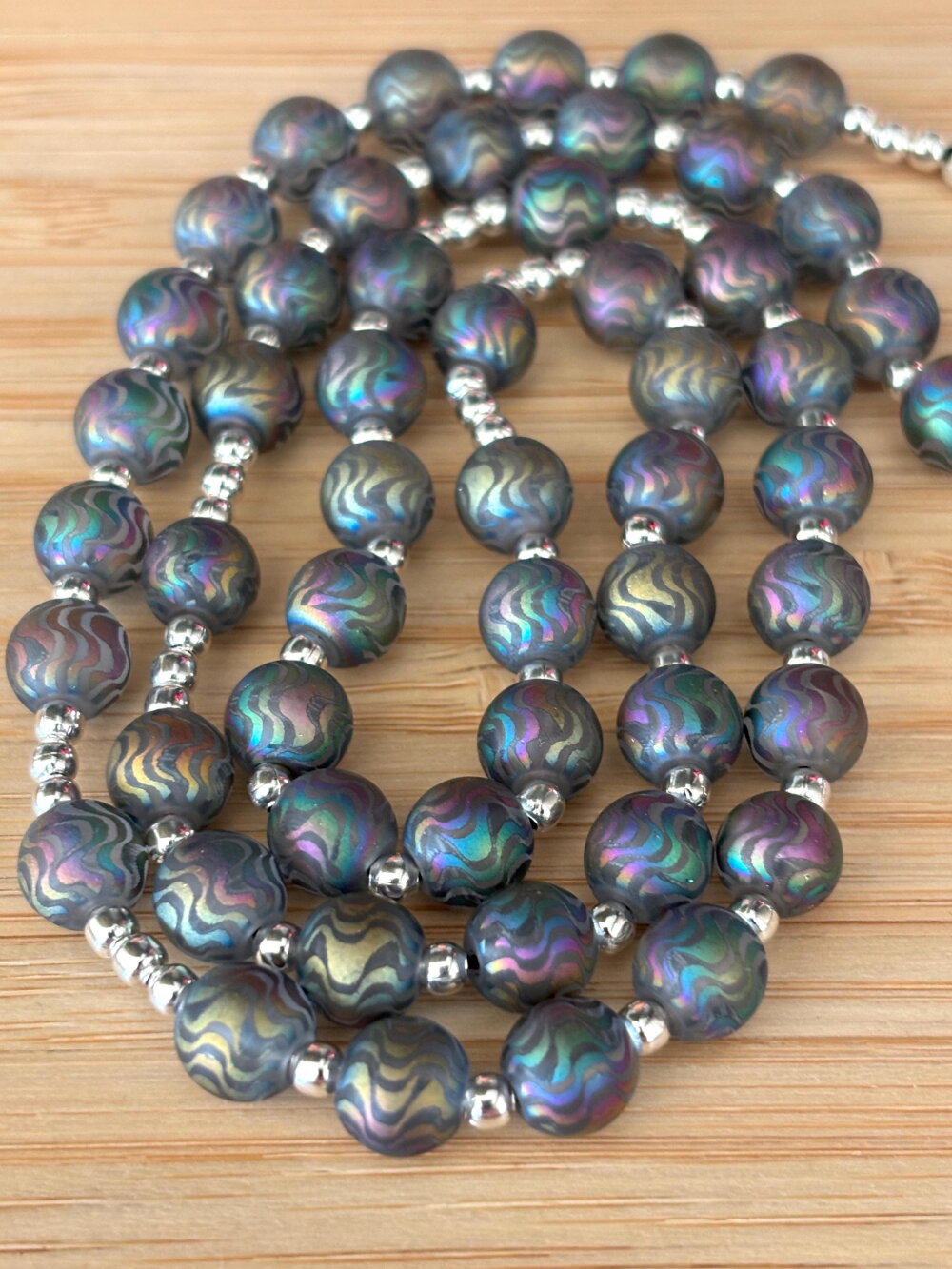 Découvrez notre chapelet artisanal en perles de verre de couleur arc en ciel avec de jolies vagues , une pièce unique alliant tradition et modernité. Chaque perle de 8 mm , est soigneusement sélectionnée et assemblée à la main avec passion et savoir-faire. Pour sublimer ce chapelet, des perles d’espacement argenté ornent le design, apportant une touche contemporaine et raffinée.