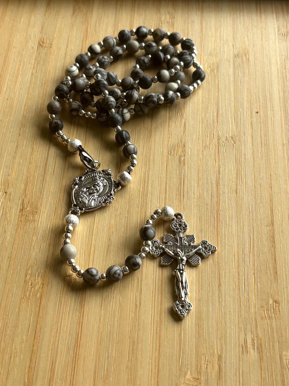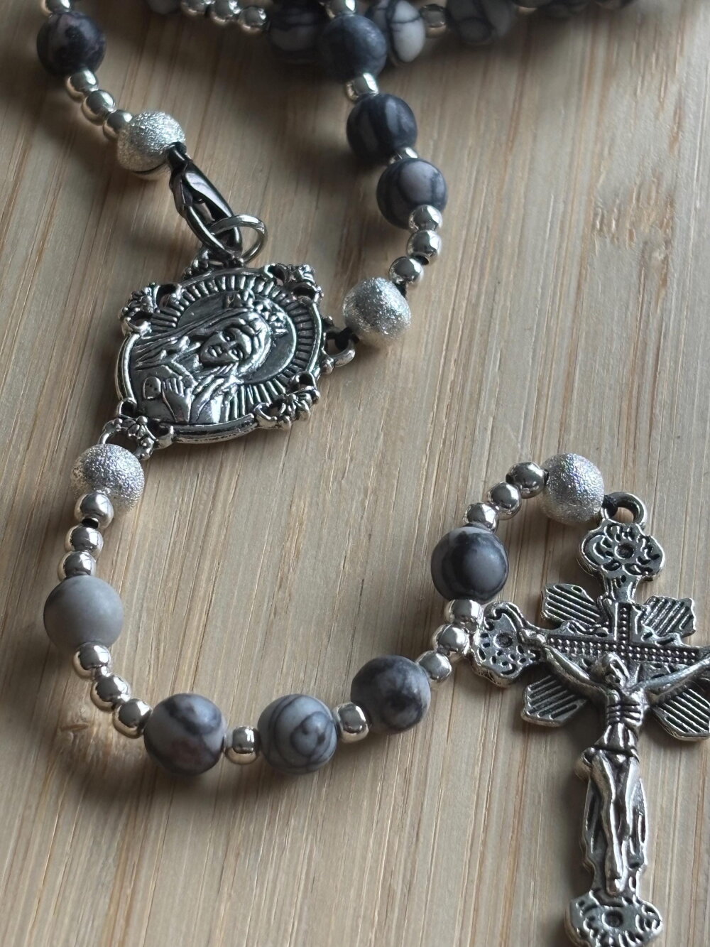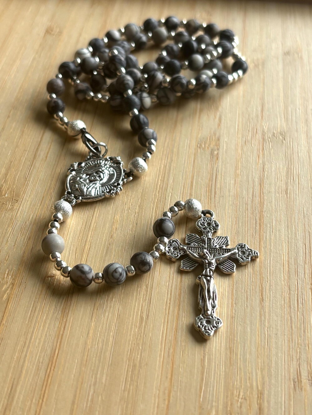 Chapelet Chrétien traditionnel, composé de perles en pierre naturelle, ici de la pierre de soie mate et satiné de 6 mm, perles d’espacements argenté.
