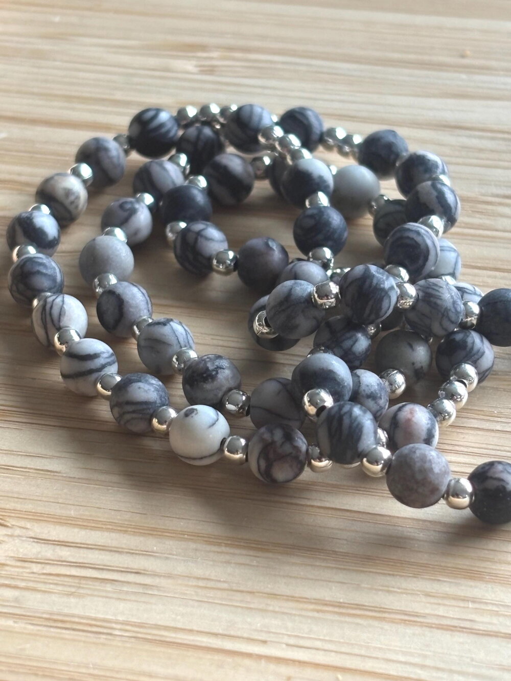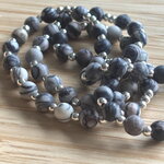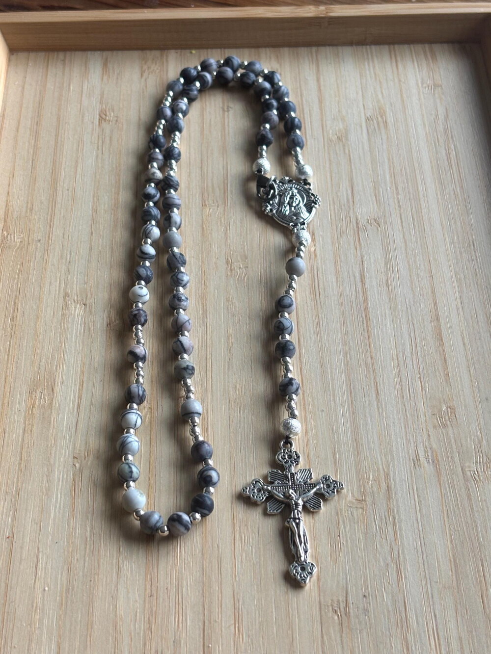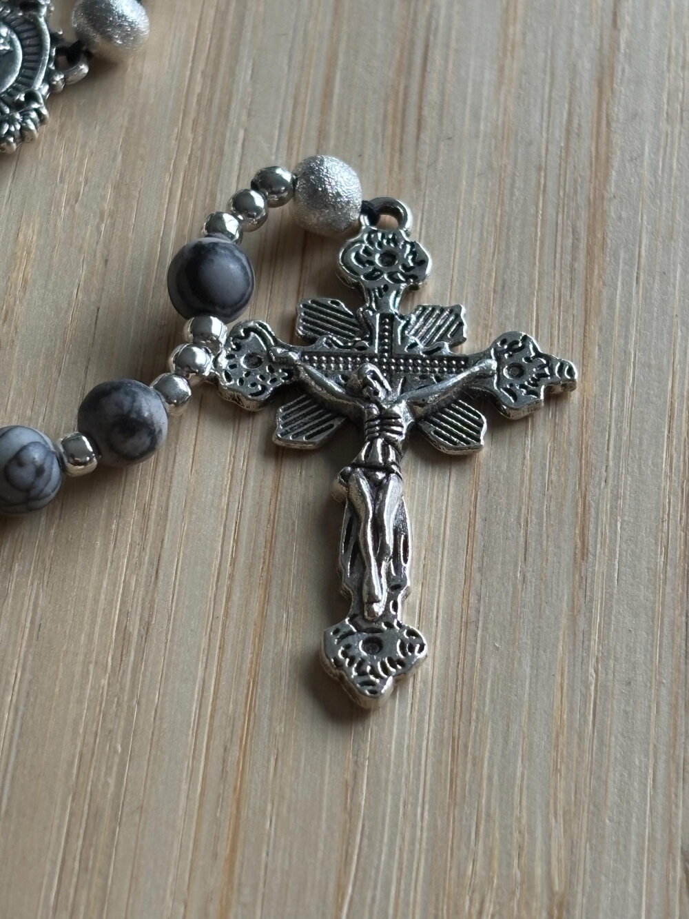 Chapelet Chrétien traditionnel, composé de perles en pierre naturelle, ici de la pierre de soie mate et satiné de 6 mm, perles d’espacements argenté.
