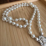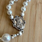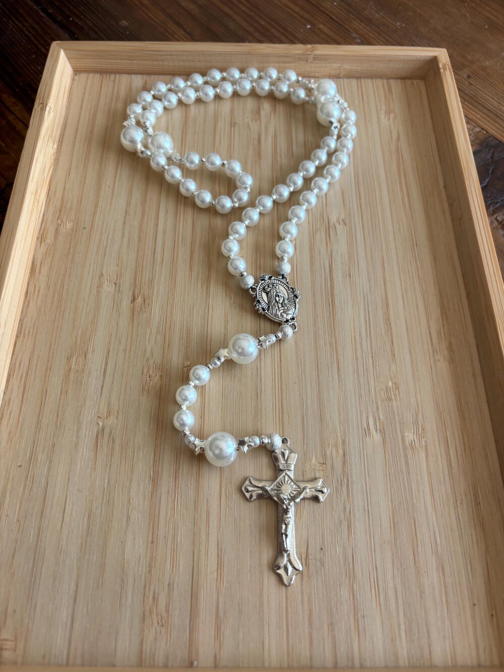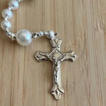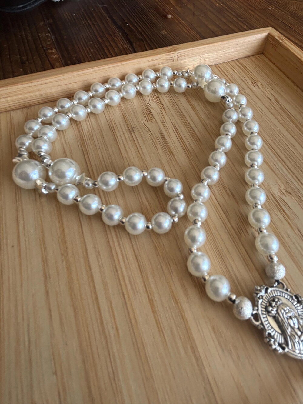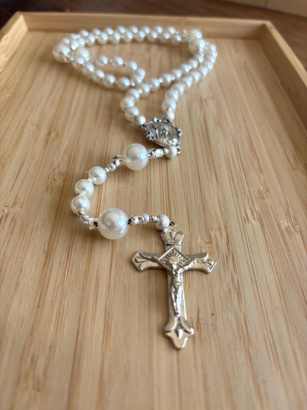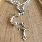 Chapelet Chrétien traditionnel composé de perles blanches satinées et nacrées de 10 mm, de 4 mm et 6mm.