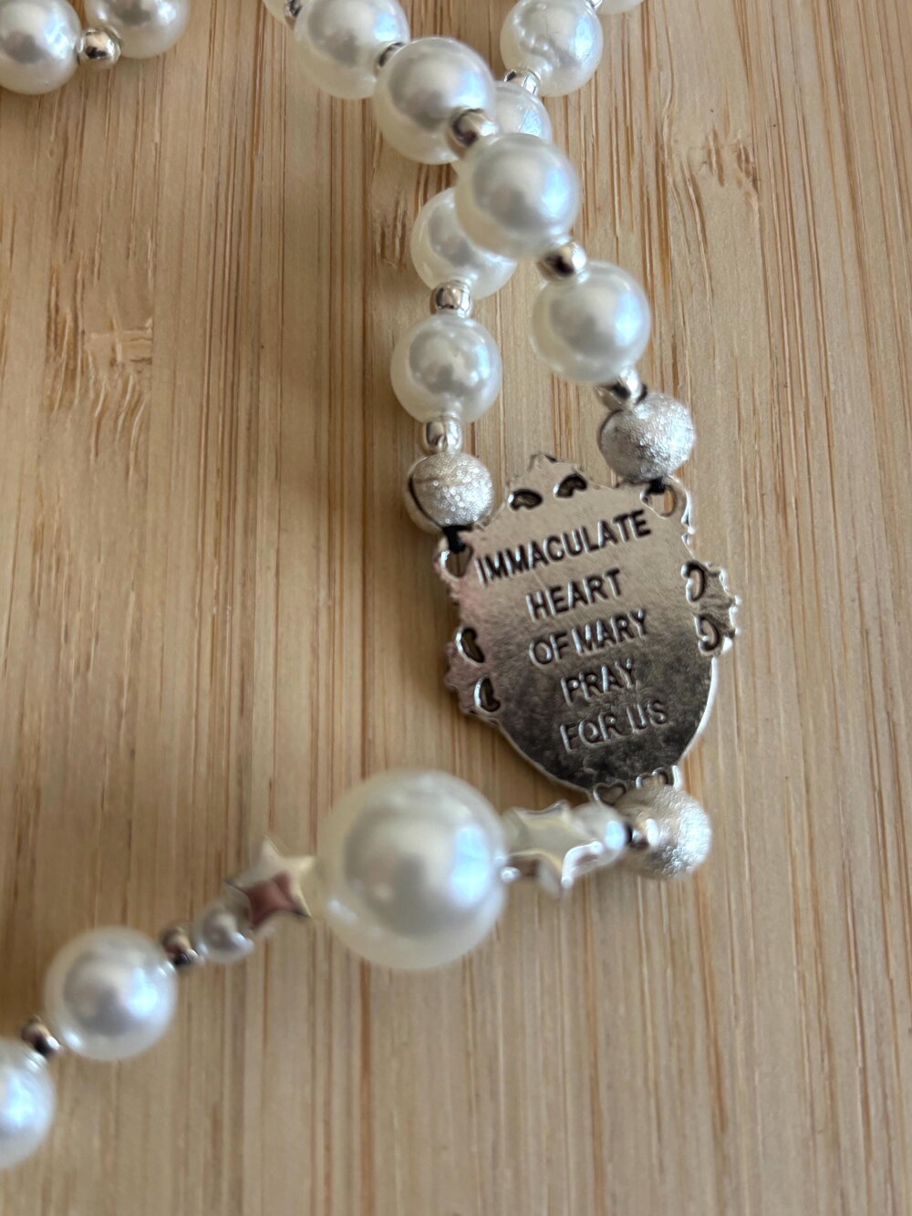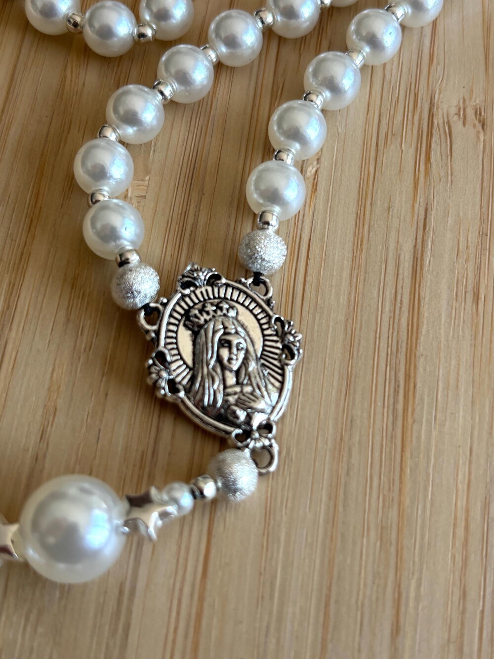 Chapelet chrétien, rosaire chrétien, chapelet traditionnel catholique, chapelet blanc nacré, chapelet blanc argent, chapelet étoile argenté