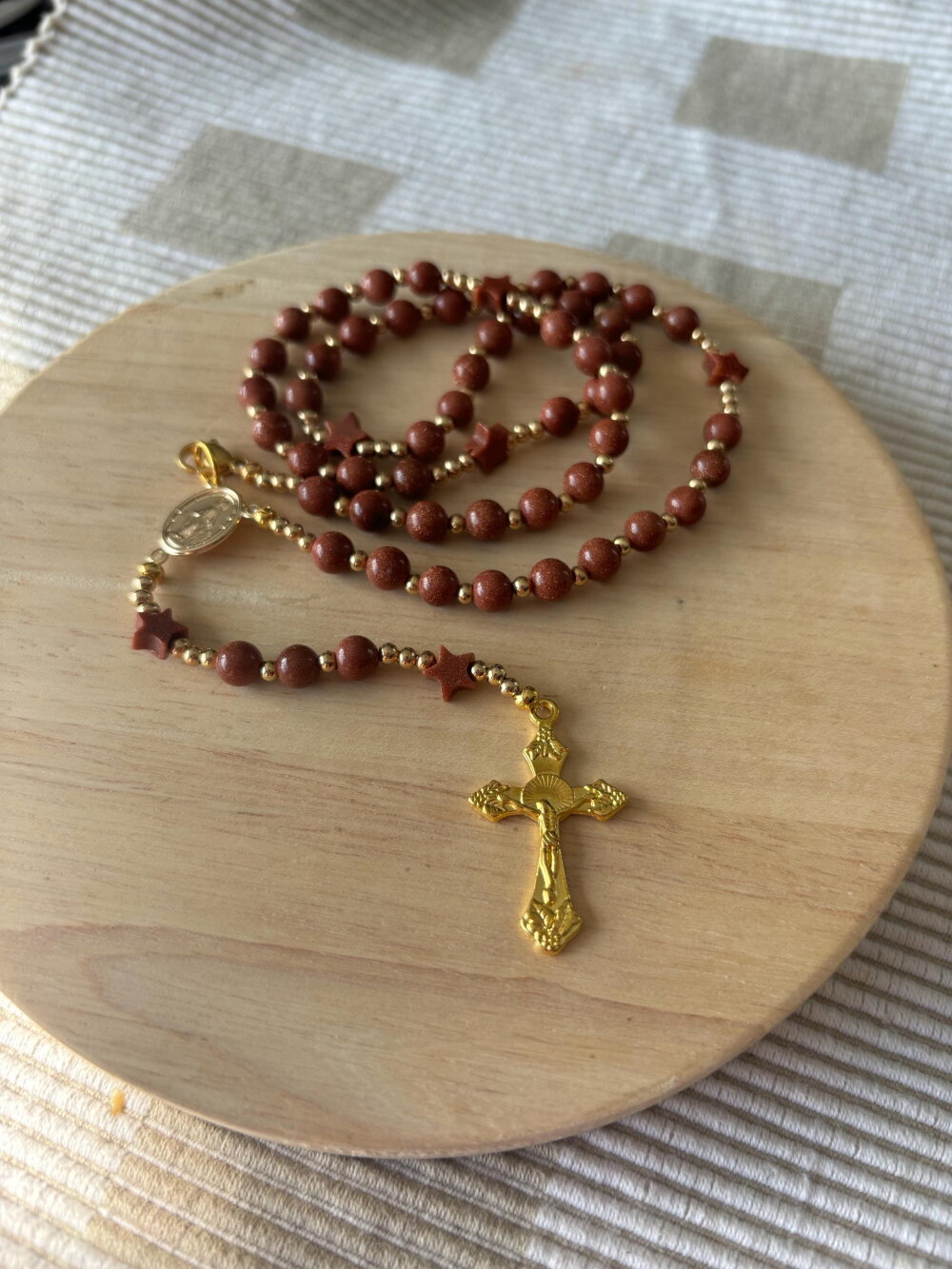 Découvrez notre chapelet artisanal en goldstone , une pièce unique alliant tradition et modernité. Chaque perle de 6 mm en goldstone naturelle, reconnue pour ses propriétés apaisantes, est soigneusement sélectionnée et assemblée à la main avec passion et savoir-faire. Pour sublimer ce chapelet, des perles d’espacement doré ornent le design, délicatement agrémentées de petites étoiles en goldstone élégantes, apportant une touche contemporaine et raffinée.