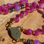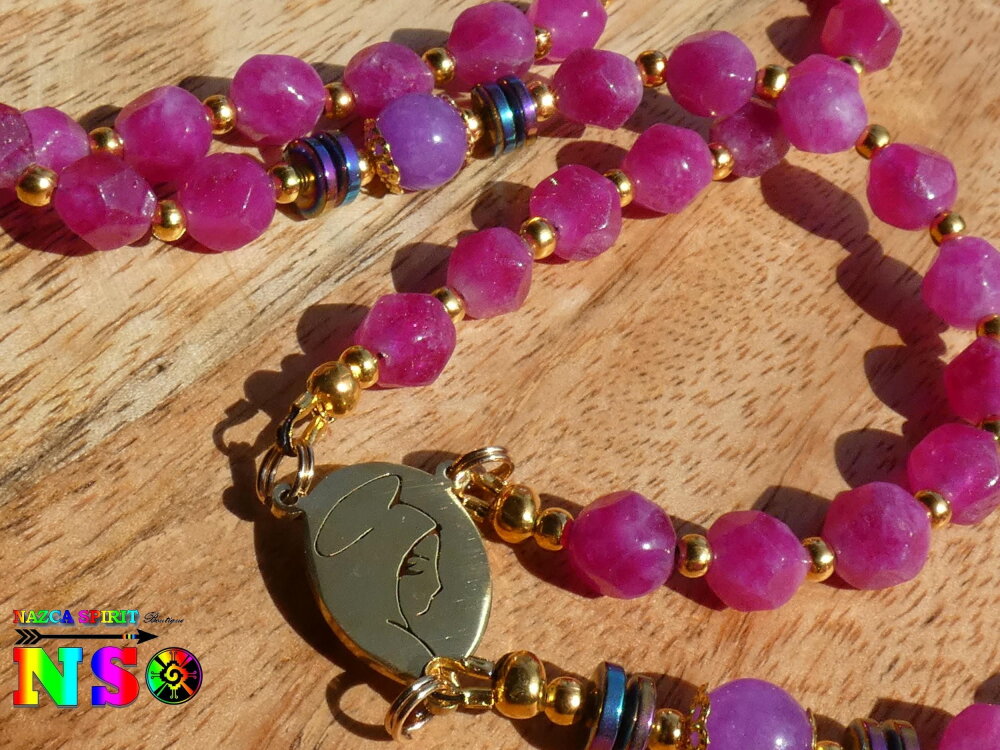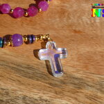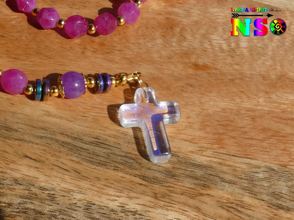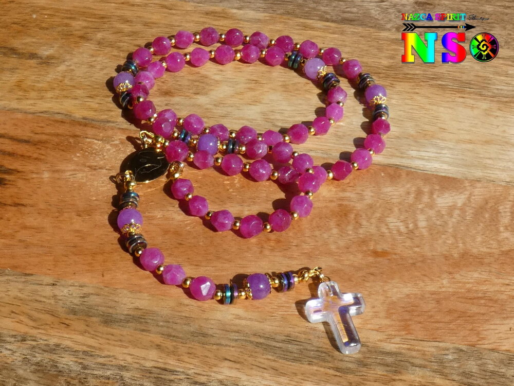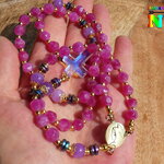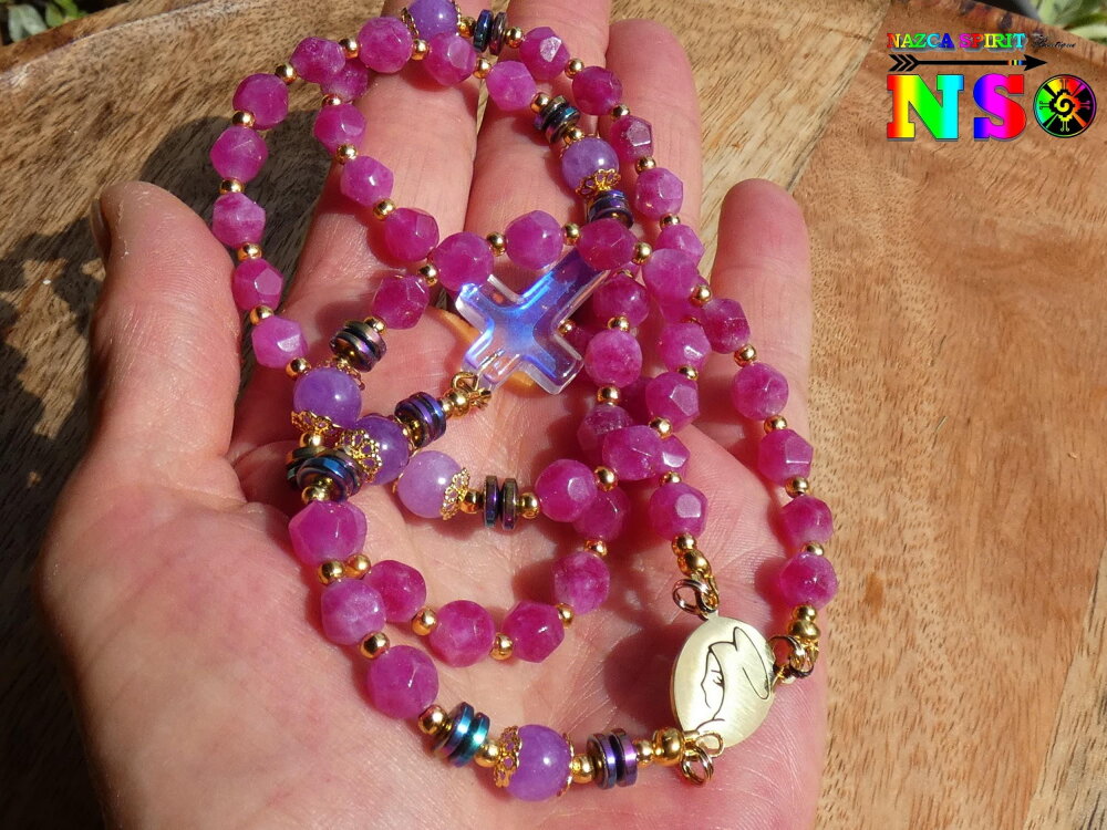 Je vous invite à découvrir un précieux chapelet monté intégralement à la main. Le chapelet est composé de 5 séries de 10 perles facettées en tourmaline rose, de 4 perles en améthyste lavande, de perles disques en hématite arc-en-ciel, de petites perles et coupelles ciselées en laiton doré, d'un connecteur en acier inoxydable plaqué or représentant la Vierge Marie (magnifique gravure moderne), d'une série de 5 perles (1 perle en améthyste, puis 3 perles en tourmaline rose, puis 1 perle en améthyste lavande. Les perles ont été montées sur un fil câblé en acier inoxydable afin d'apporter une grand solidité à ce chapelet. Le bout du chapelet se termine par une très jolie croix chrétienne en opaline reflet rose bleuté.