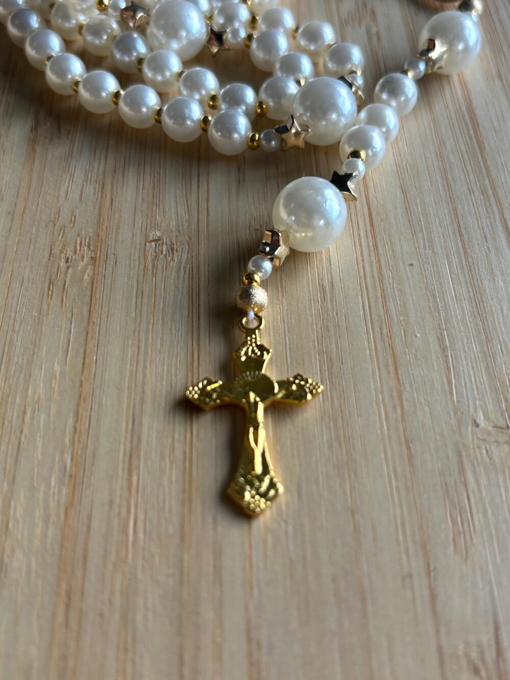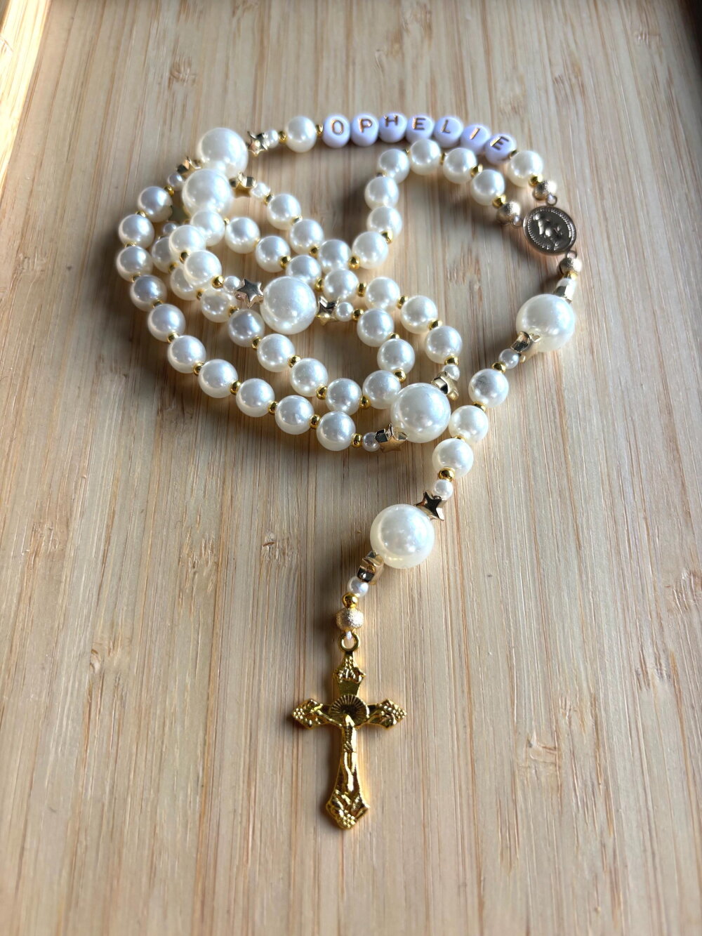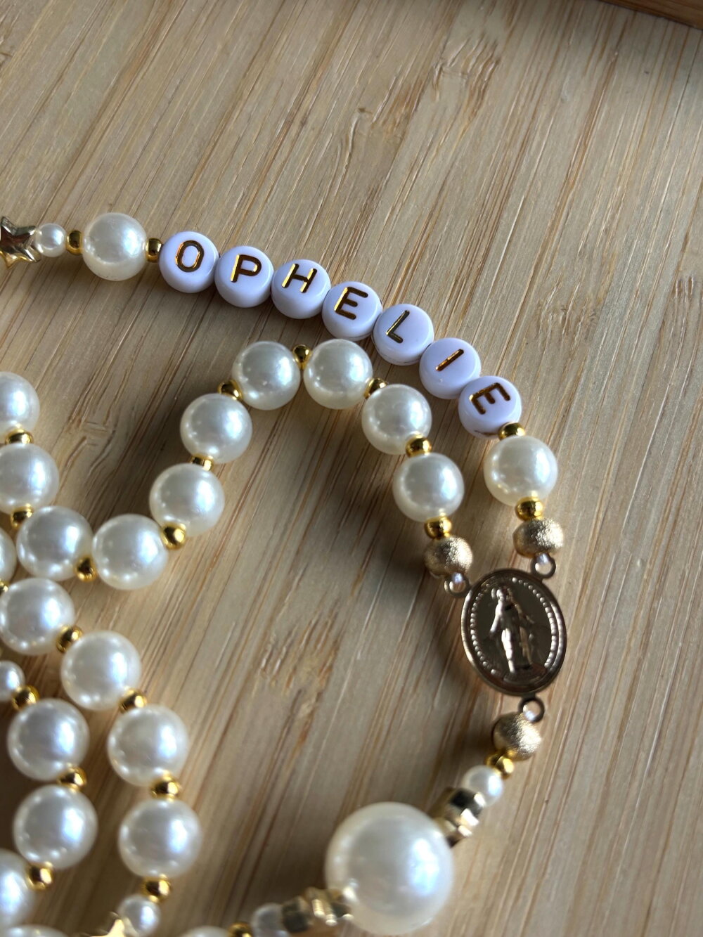 Chapelet personnalisé avec prénom, perles blanches nacrées, vierge Marie plaqué or, cadeau religieux élégant, baptême, communion, mariage