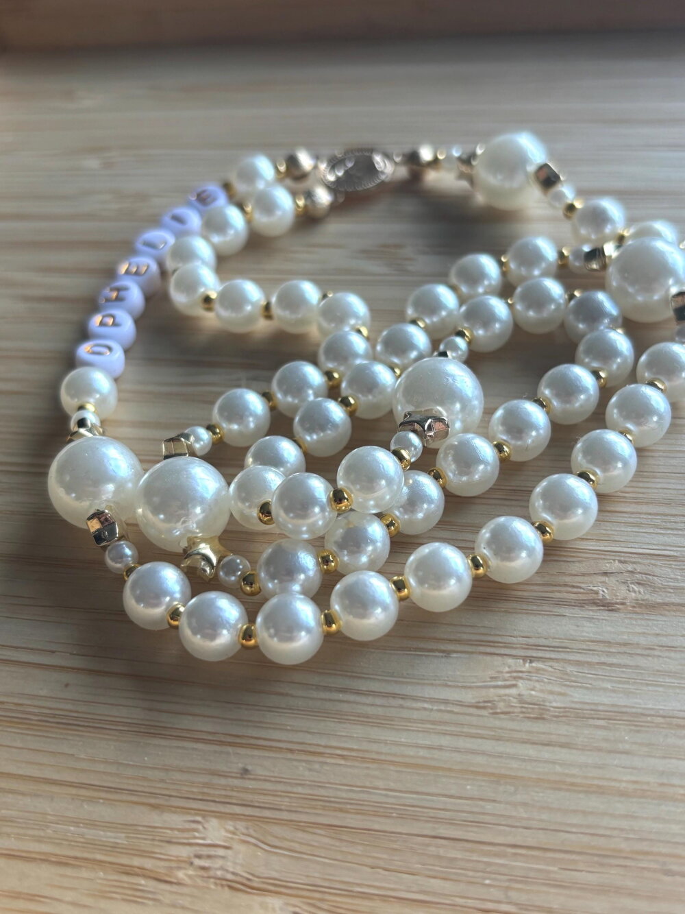 Chaque pièce est confectionnée à la main avec des perles blanches nacrées de 4, 6 et 10 mm, symboles de pureté et de lumière.
