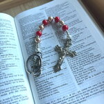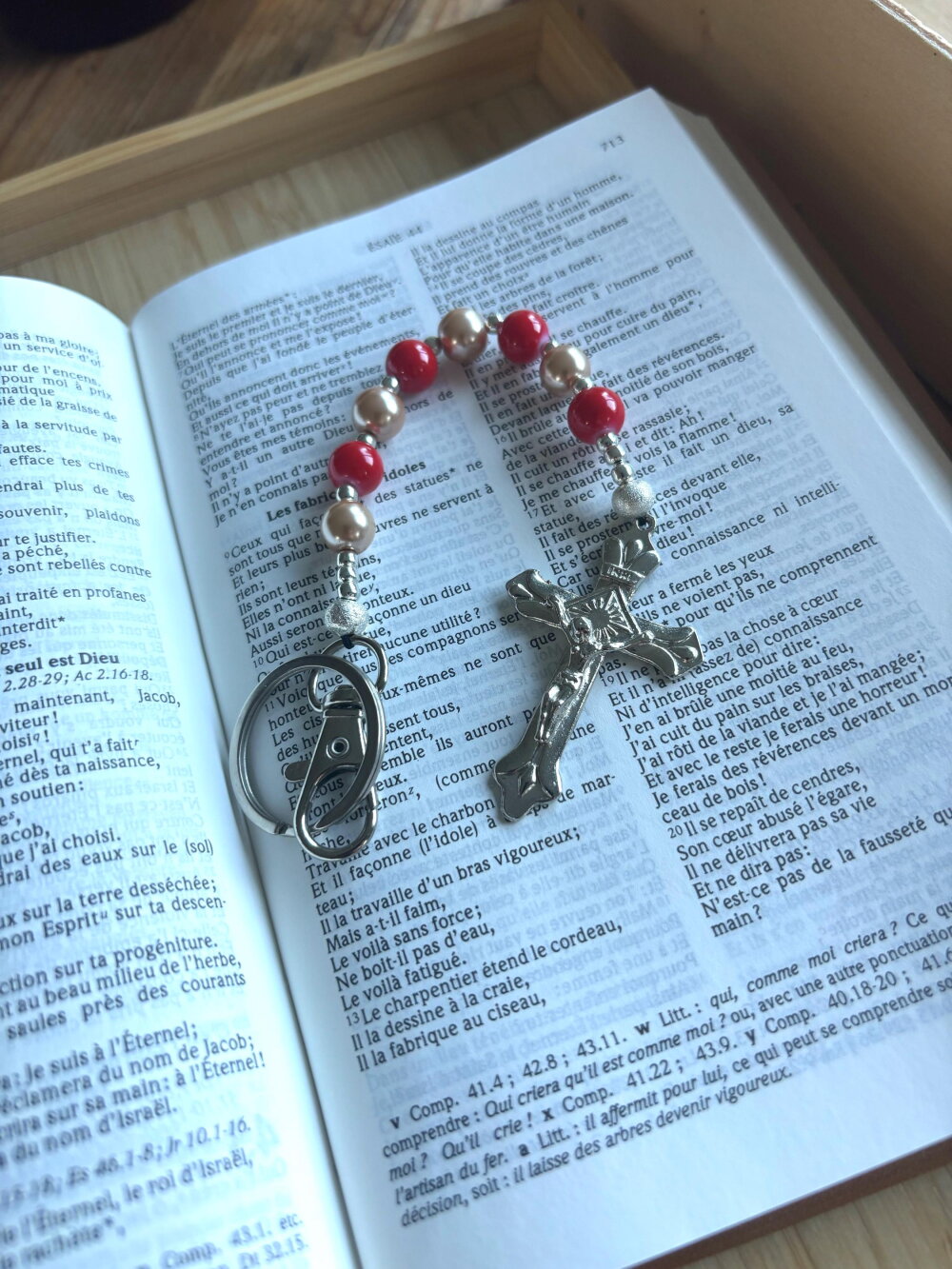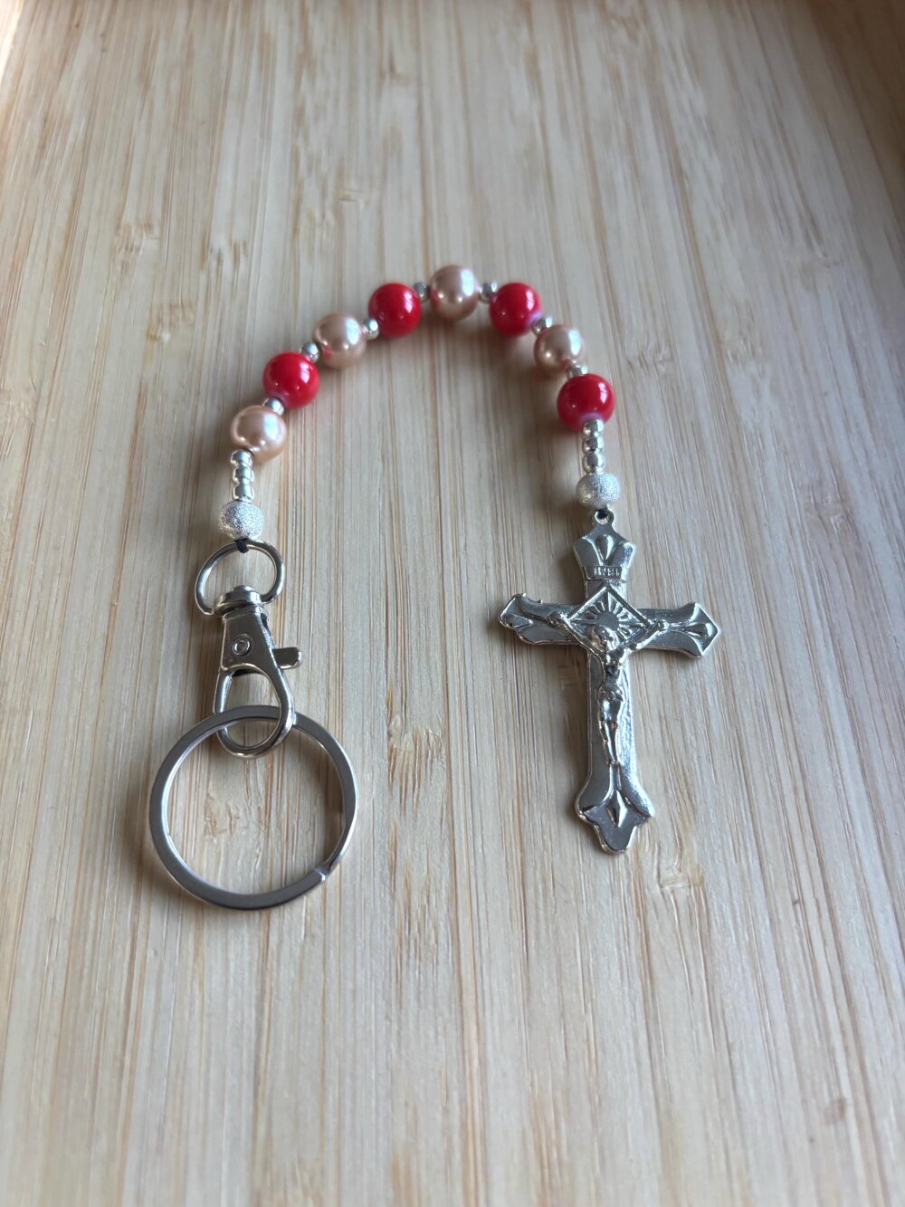 Chapelet porte clés, rosaire porte clés, croix argent, chapelet perles nacrées, chapelet perles beige rouge, porte clés beige nacré rouge