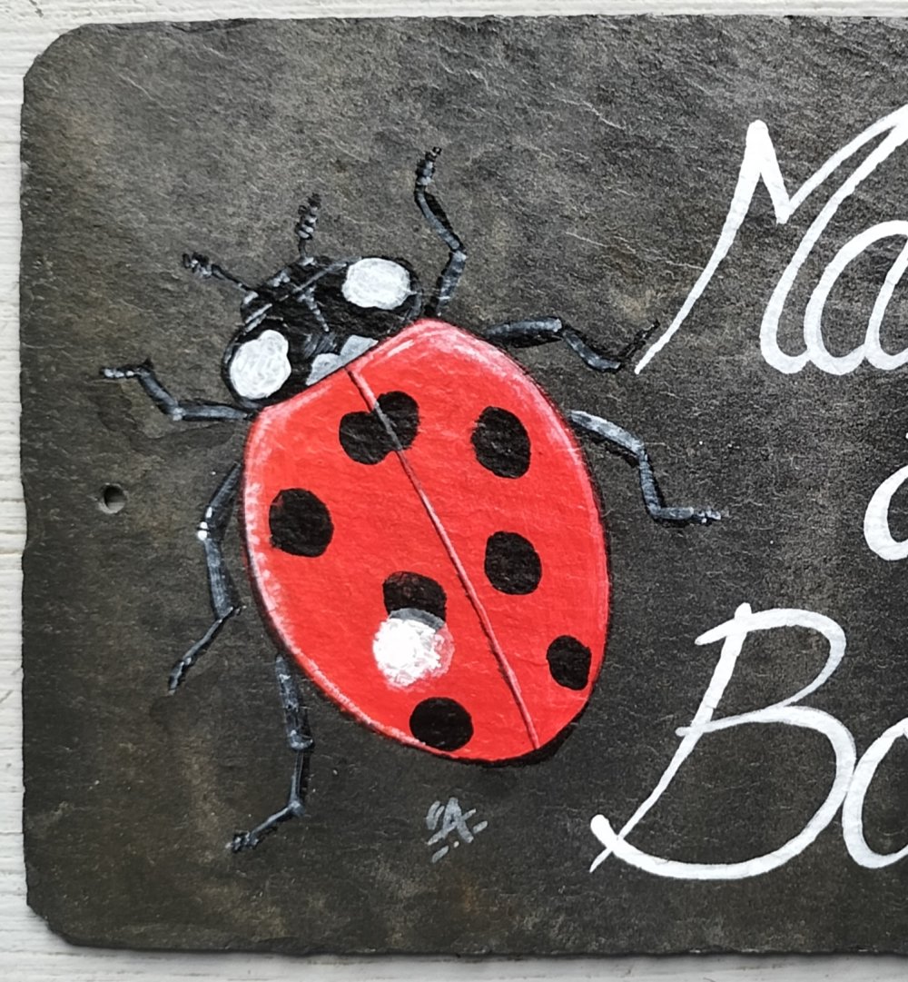 Coccinelle Maison du bonheur, peinture acrylique sur ardoise, pour mettre de l'originalité et de la bonne humeur dans votre entrée de maison. Toutes mes créations sont originale et uniques. Elles sont aussi percées et vernis avec un vernis très haute qualité. Vous pouvez la fixer facilement où vous le souhaitez.