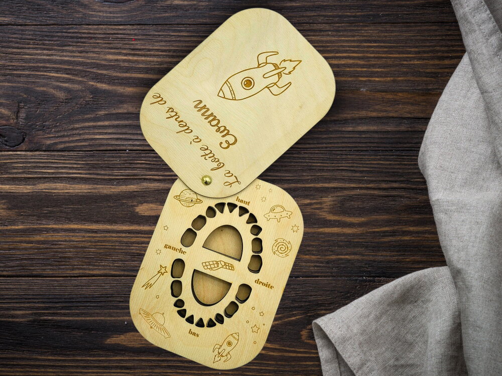 Boîte à dents de lait en bois – modèle Astronaute. Fait main en France, personnalisable et poétique. Un souvenir plein de rêve et de douceur pour votre enfant.