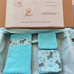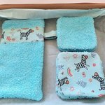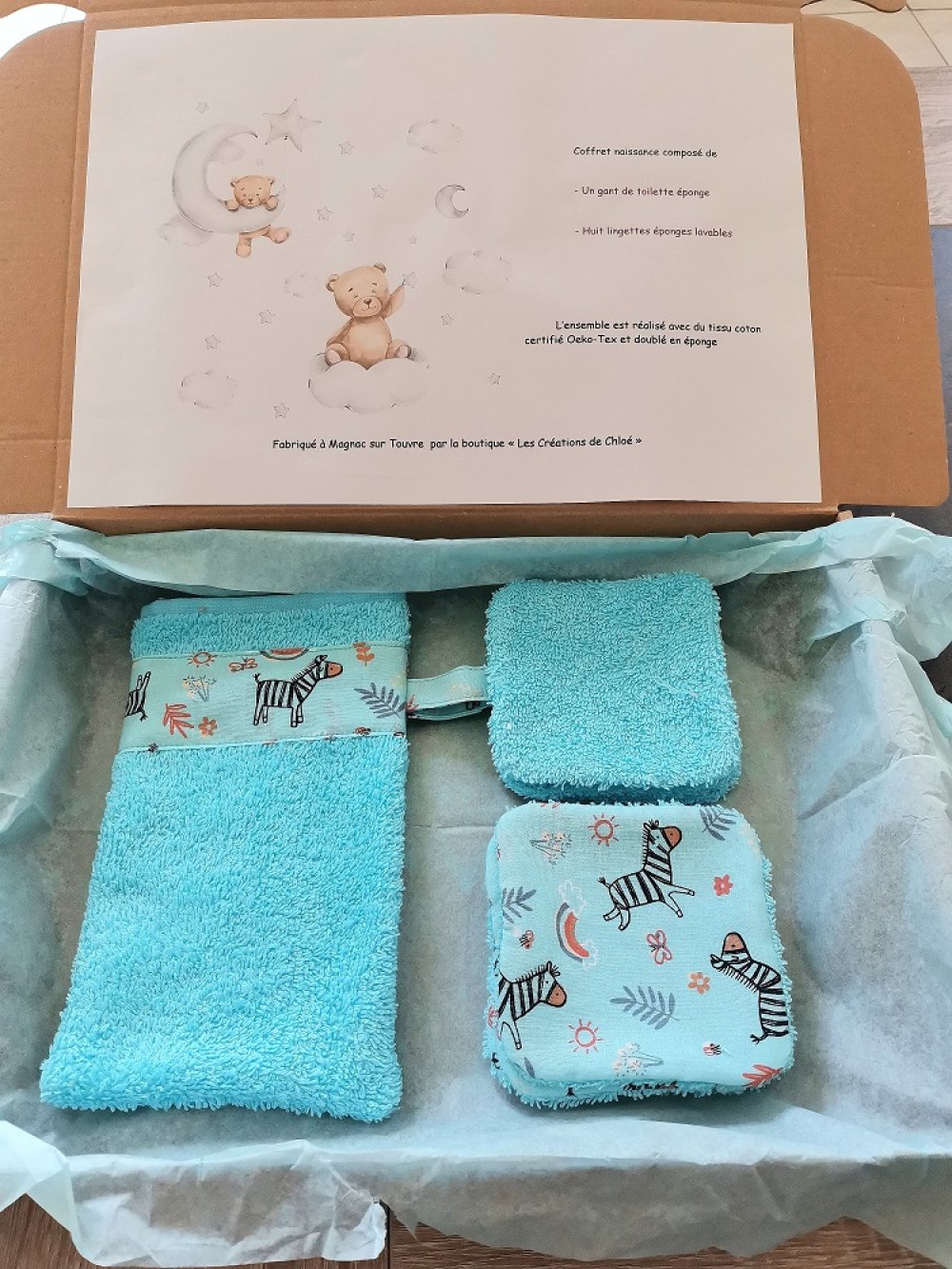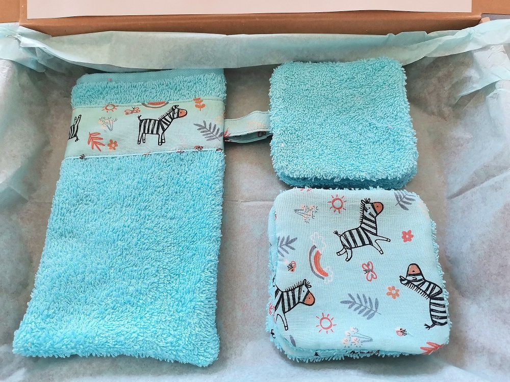 - huit lingettes toutes douces en coton imprimé certifié Oeko-Tex et éponge pour la toilette de bébé ( format 9 x 9 cm ).