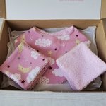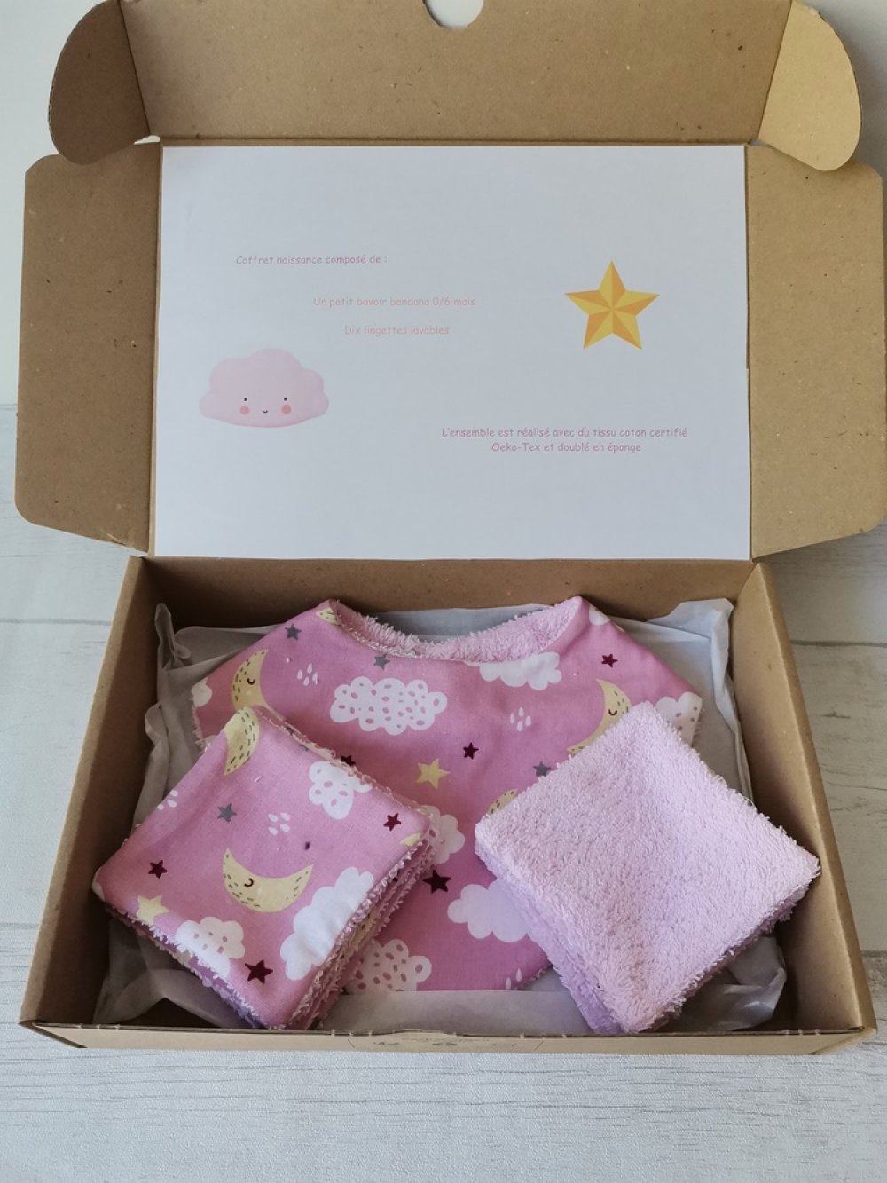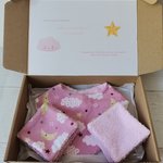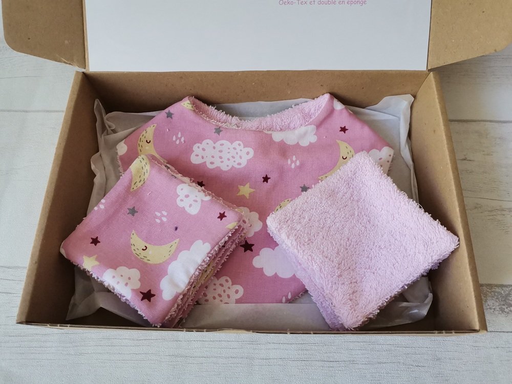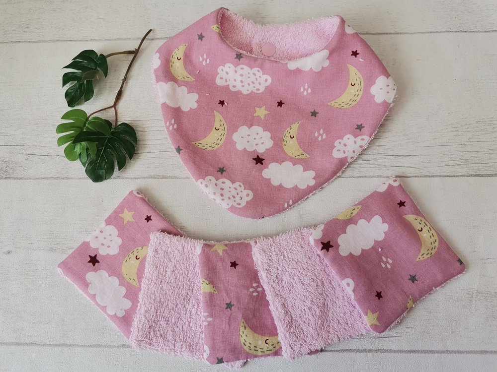 - dix lingettes toutes douces en coton éponge de couleur rose et coton certifié Oeko-Tex motif ciel pour la toilette de bébé ( format 8.5 x 8.5 cm ).
