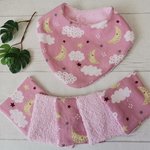 - un petit bavoir bandana 0 à 6 mois doublé coton éponge fermeture par bouton pression résine rose.