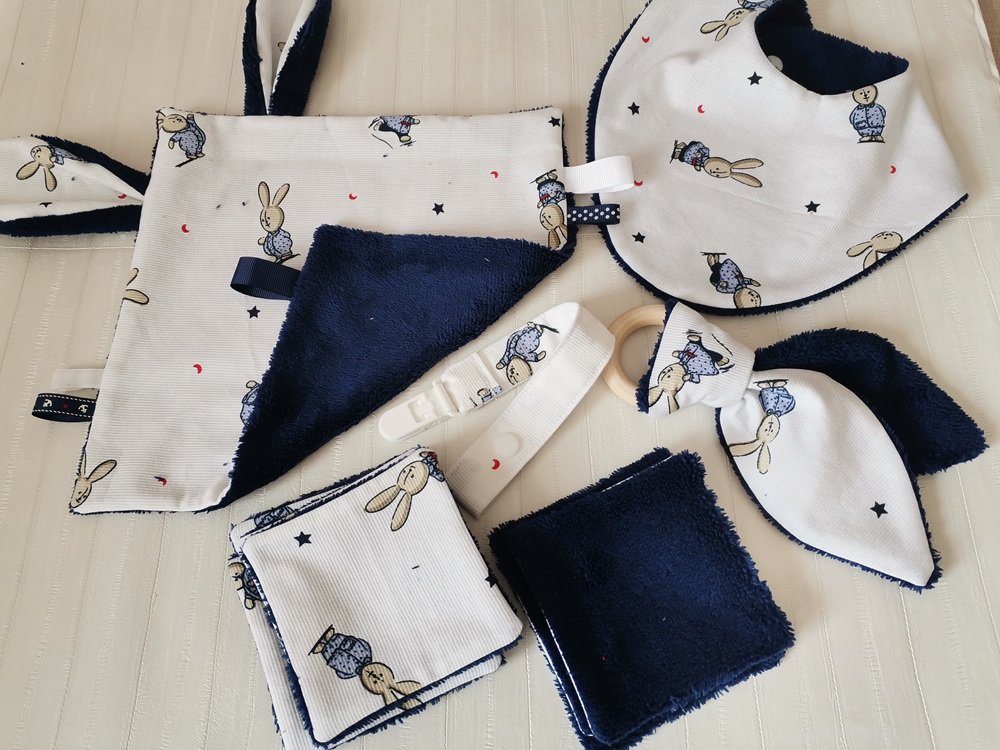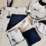 - 8 lingettes toutes douces en coton peigné motifs lapins et éponge bambou bleu marine pour la toilette de bébé ( format 9 x 9 cm )