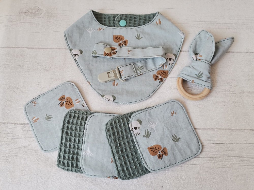 - six lingettes toutes douces en coton certifié Oeko-Tex et nid d'abeilles pour la toilette de bébé ( format 9 x 9 cm )