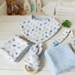 Ensemble naissance bavoir, 10 lingettes, hochet et attache tétine bleu