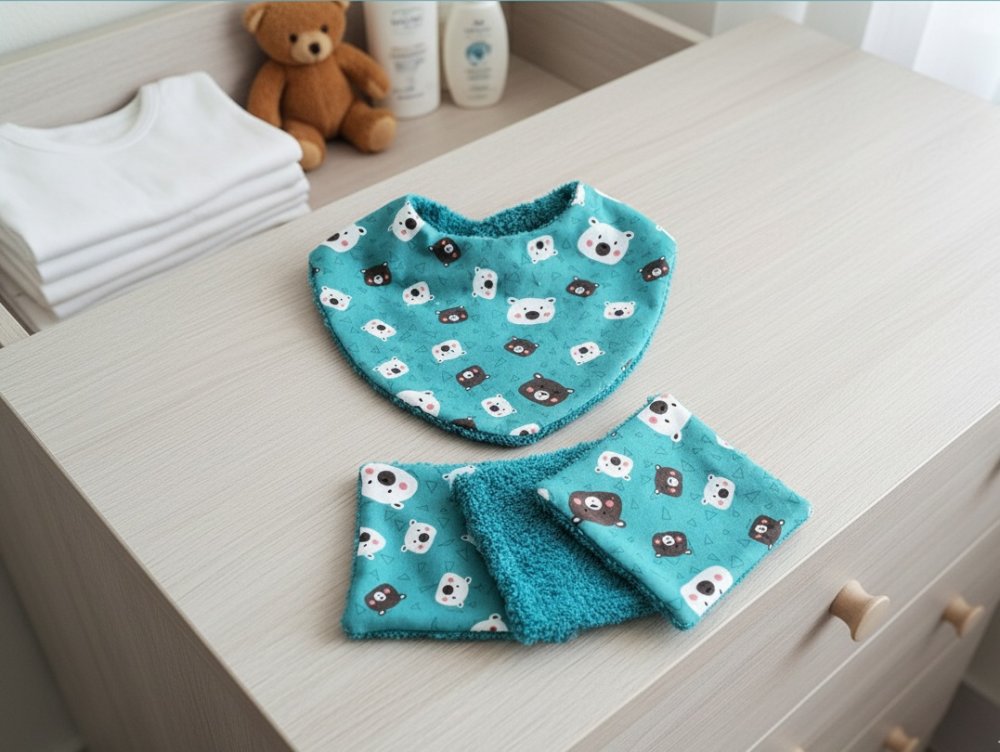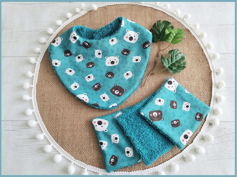 - huit lingettes toutes douces en coton éponge de couleur turquoise et coton certifié Oeko-Tex motif têtes d'ours pour la toilette de bébé ( format 8.5 x 8.5 cm ).
