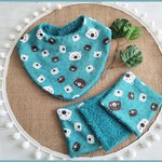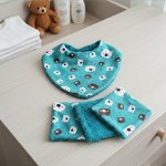 - un petit bavoir bandana 0 à 6 mois doublé coton éponge fermeture par bouton pression résine turquoise