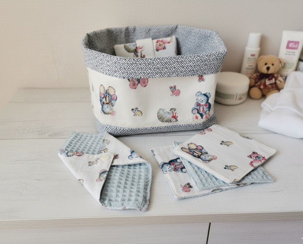 Ensemble naissance composé d'un petit panier pour y ranger les produits lavants pour bébé ou des couches, 1 pochette à savon doublé en tissus nid d'abeilles et fermée par un bouton pression, 10 lingettes coton doublé nid d'abeilles, 1 pochette à lingettes, 1 petite bourse pour tétine.