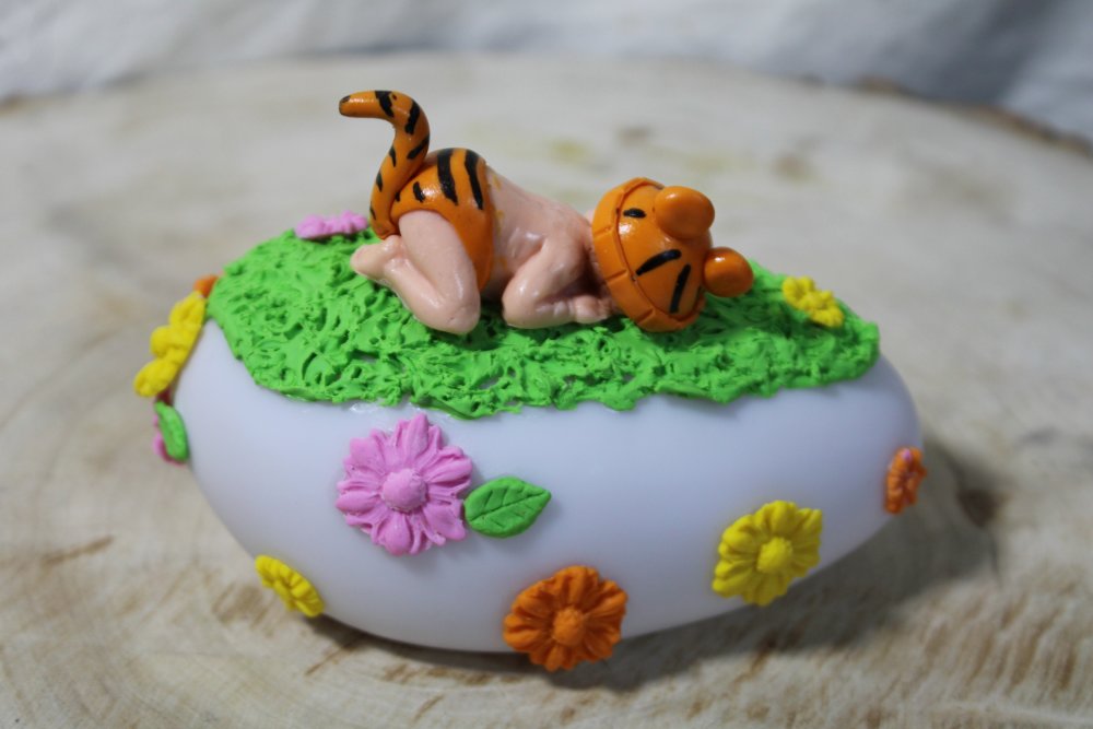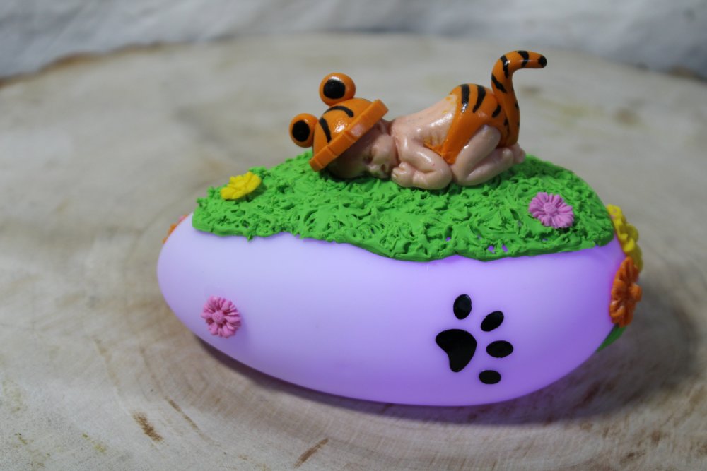 veilleuse avec changement de couleur et bébé déguisé en tigrou